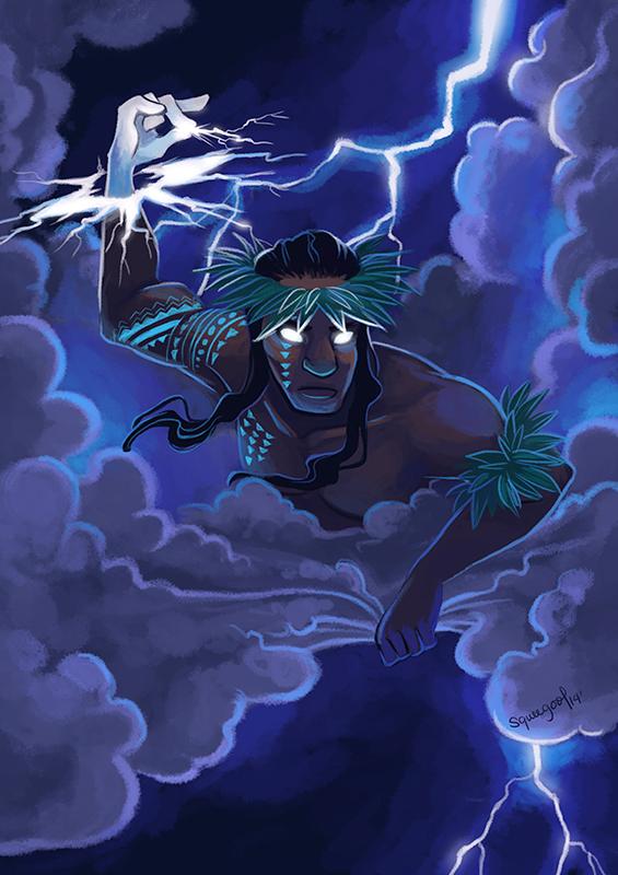 Colui che non nacque poteva morire, colui incolpato dei delitti della madre cerca in realtà solo di aiutare, colui che non ha forza tiene il cielo su in alto. Nessuno sa quando Haikili nacque, nessuno sa nemmeno se questo evento successe davvero, l’unica cosa sicura è che questo essere esiste e anche se lentamente invecchia come noi e così morirà. Prima del grande inganno non serviva a niente, era un semplice messaggero che veloce portava ogni forma di messaggio tra dei lontani infinità. Poi scoprì il suo ruolo nel mondo, con Ino intrappolata e adirata i fulmini continuavano a piovere come fosse pioggia e la pioggia cadeva come fossero massi, lui non poteva permettersi tale distruzione, non era un dio, aveva bisogno di terra, sole, acqua e cibo per sopravvivere, se tutto fosse stato distrutto dai fulmini sarebbe stato il primo a morire. Iniziò quindi a sfruttare la sua velocità sopra ogni limite per catturare tutti i fulmini, solo che non sapeva dove metterli, e non aveva più tempo per riposarsi, anche facendo così sarebbe morto. Capì cosa doveva fare: nutrirsi dei fulmini e continuare questa via fino ad una soluzione, i fulmini lo sostenevano, lo rendevano ancora più veloce mentre lo attraversavano, i pochi che gli sfuggivano generavano lamenti tanto potenti da parte della creatura che gli altri mortali hanno iniziato a dargli un nome: tuoni. Continuò così, e continua così, nessuno dei suoi fedeli, dei suoi simili, nessun altro mortale vuol prendere il suo posto e Kanaka è semplicemente troppo occupato con i suoi progetti, i suoi piani e le sue civiltà per far quel lavoro.