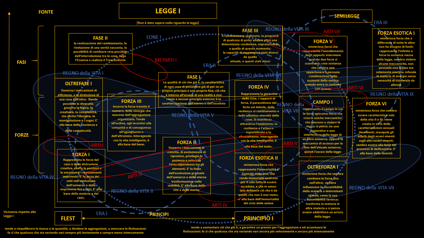 "...come è possibile vedere dal disegno della pagina precedente. Ciò che ho chiamato Arti I, e mi si perdoni questo piglio scientifico, fa riferimento a tutti quei tipi di magia che sfruttano la Forza I e la Forza II. Evidentemente, un primo approccio alla magia da parte di civiltà agli albori della loro storia porta quasi automaticamente a sviluppi autoctoni di forme che possono essere assegnate a questa forma. Gli esempi in tal senso sono molteplici e variegati, ma non meno coerenti nella loro struttura base, dinamica che mi ha spinto ad aggregarli appunto nella forma Arte I. Il numero attribuito ha quindi a che vedere con la raffinatezza della forma magica, derivante a sua volta dalla maturità della civiltà che la ha prodotta, funzione più o meno lineare della semplice età della cultura. Una parte di questo testo sarà in seguito dedicato a storie della magia esotiche, tra cui analizzerò la nostra cultura che ha stranamente sviluppato in contemporanea una sorta di bizzarro, curioso e precoce calderone tra le forme I, III e anzitempo V dell'Arte. Tra i praticanti che hanno seguito questa dinamica classica possiamo citare: gli Asshandè di Veli (elementalisti arniatori con accesso a svariate forme di manipolazione del calore), i Klastrxuthnstos di Tlachon (manipolatori di flogisto a fini abiurativi, per scelta non adoperavano), i Vlarr di Zerusk (classici invocatori di flogisto), gli Etakairen di Haiss (manipolatori di archeoscintille), gli Uluturia di Kulthord (embrionatori di veli elementali; avevano sviluppato anche una particolare affinità alla Forza IV e in particolare agli erebi bianchi e leuchi, tanto che si attribuisce a loro l'immenso filone delle magie d'ombra bianca infuocata), i Bolbdob di Galbomh (usavano una forma elementale di termoaure e avevano incominciato ad attingere a fonti riconducibili alla Forza II), i Jjkraai di Andrjk (nulla è pervenuto della loro tradizione magica), i Thier di Walisteria (ammortizzatori di cariche; ho inserito questa civiltà non tanto per la giovane età, quanto per il disinteresse per la magia che la rende simile ad una civiltà agli albori della sua storia magica), e quelli che noi chiamiamo volgarmente "sciamani" delle antiche civiltà appartenenti ai territori che adesso sono: Amalassia, Walreyn, Garbond, Romendor sud (tutte le città della Costa d'Oro Rosa), Vinginor sud-orientale (le regioni del Silithien, Fergoras, Numilas orientale, Meriagon e Normendas), Phalias, Daraukar, Karthenren. Mi soffermerò comunque su tre tipi di figure di maghi: gli Etekairen di Haiss per la loro influenza sulla nostra magia, gli sciamani di Amalassia per la vastità delle loro traduzioni (che forse meriterebbero un libro separato...), e i Vlarr di Zerusk per la linearità della loro storia.