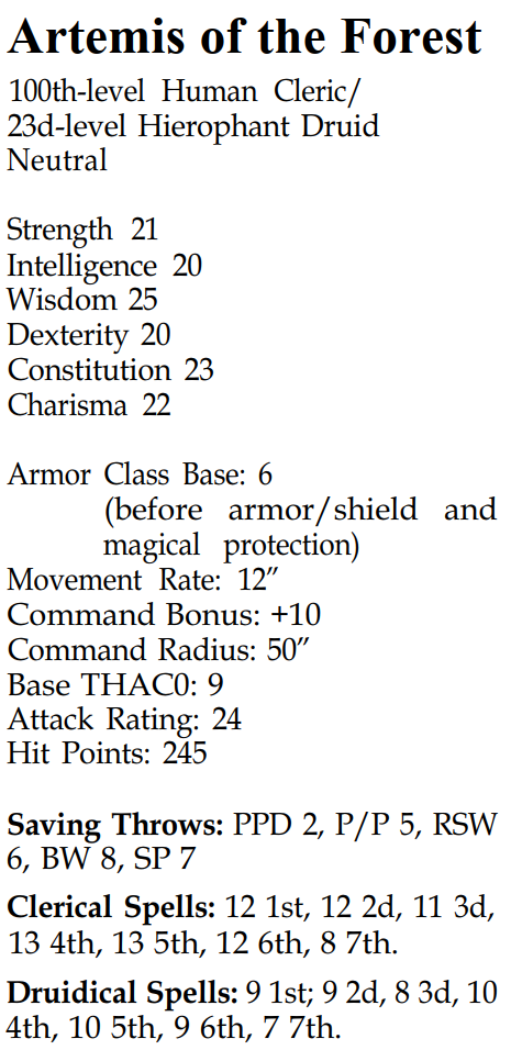 Poi c'è la parte da Druido... Perché è al 23° livello? Perché questo è il massimo livello che un druido può raggiungere. Proprio come i monaci 1e, i druidi hanno un limite massimo a cui possono arrivare e ottengono abilità stravaganti ad ogni livello. Essendo Gerofante di massimo livello possibile, Artemis può: