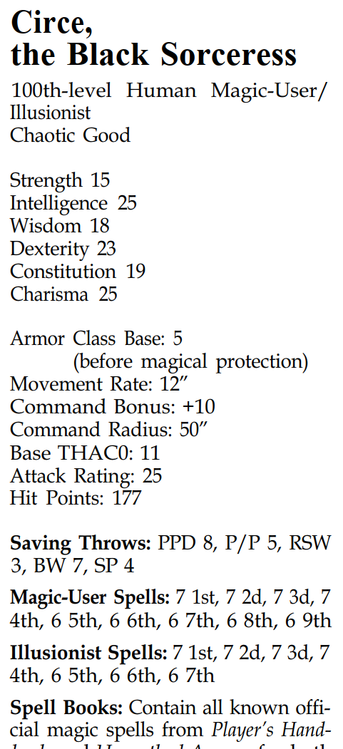 Circe vaporizza Cthulhu da oltre mezzo miglio di distanza, mentre vola. Cthulhu ha quella che sembra essere una grande resistenza magica: ben 80%. Ma in AD&D 1e la resistenza alla magia funziona in modo strano. Il valore della resistenza è basato su un avversario di 11° livello. Per ogni livello inferiore dell'avversario, la resistenza aumenta di un 5%. Per ogni livello superiore all'11 dell'avversario, diminiusce di 5%. Contro un incantatore di livello 100, Cthulhu ha una resistenza magica effettiva di -365% (quindi non ne ha alcuna).
