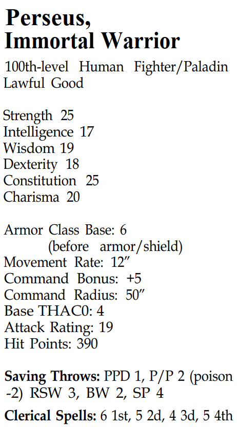 Oltre a questo, come tutti i guerrieri in AD&D, contro creature con meno di 1 DV, fa un numero di attacchi uguale al livello... quindi il nostro Perseo attacca 100 coboldi a round...