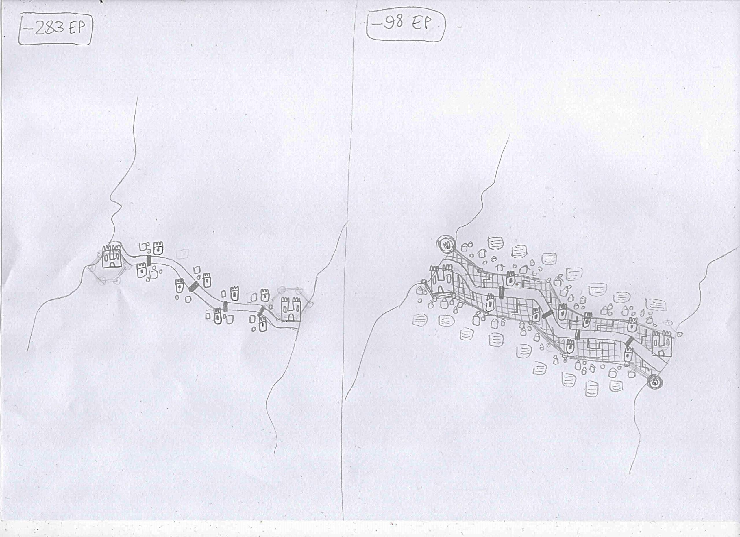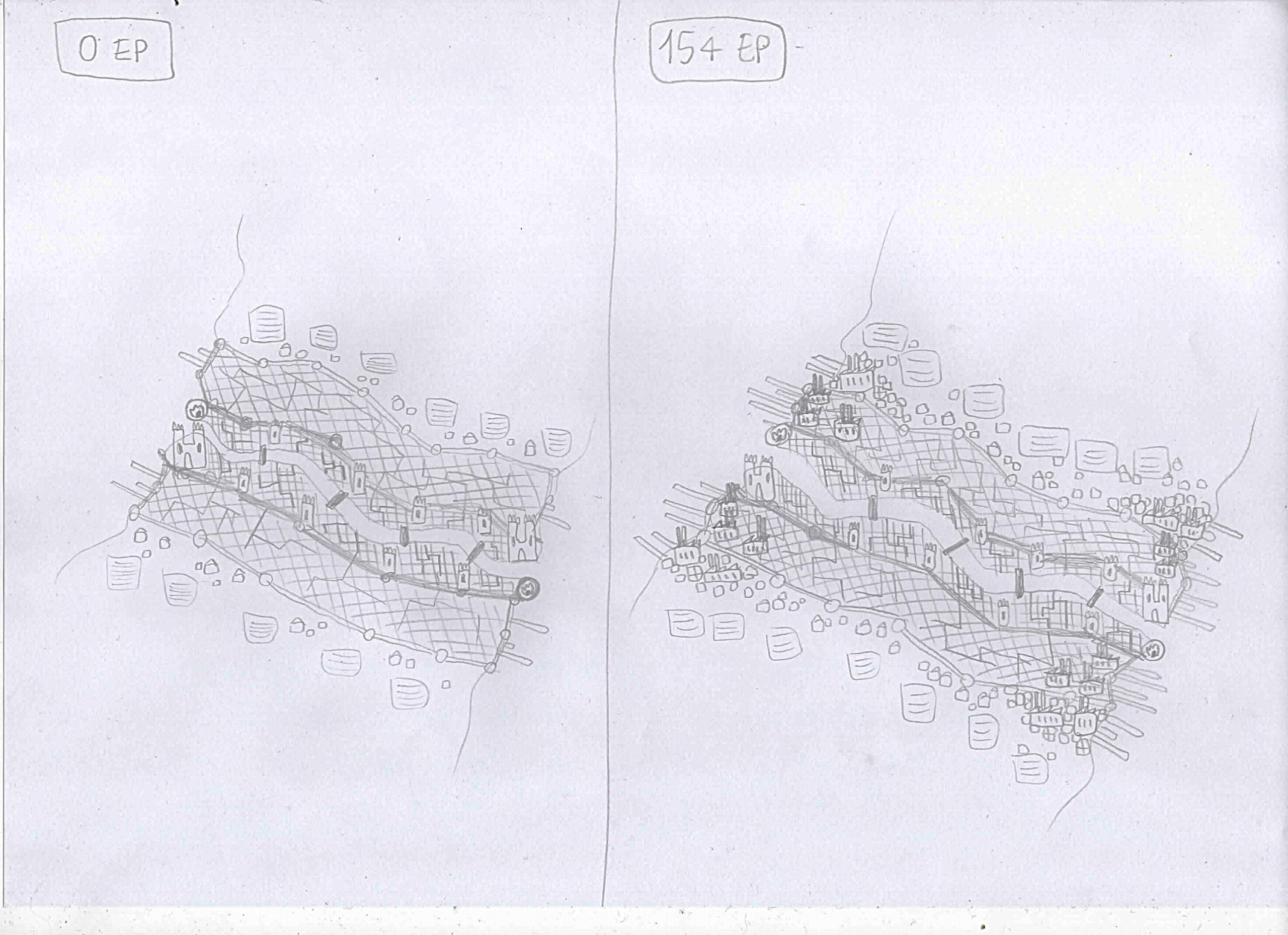 Nota. Le mappe dello sviluppo urbano di Zorastria sopra riportate non saranno incluse nel manuale di ambientazione. Le ho disegnate per accompagnarmi nella scrittura della storia della città e nella costruzione dell’attuale città, motivo per cui sono disegni fatti di fretta e grossolanamente. La mappa accurata della città di Zorastria nel 154 EP sarà inclusa nei prossimi post sull’hexcrawl della città, ed è al momento in costruzione.