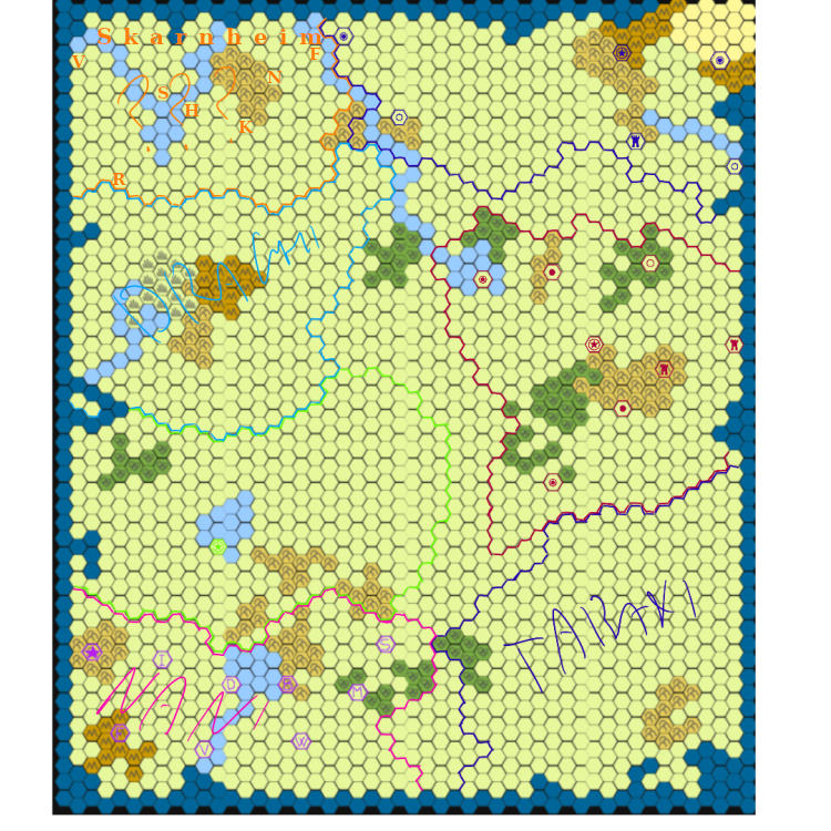 2. Skarnheim (S) Capitale Nordhamm (N) Villaggio Vargfjord (V) Villaggio Hearthgrove (H) Villaggio Kaldskar Keep (K) Castello Rasthold (R) Forte Falconwatch (F) Forte Ora la mappa dovrebbe essere completa. Chiedo scusa ma avevo fatto un pò di casino. Inizialmente avevo creduto che per creare il regno era come creare un PG per DnD ed andare di fantasia e non avevo visto il manuale. Ho rifatto anche la scheda e l'ho condivisa nell'apposita sezione, manca solo qualche piccolo dettaglio ma mano a mano l'aggiorno. Domani se riesco rifaccio anche il post iniziale. Scusatemi per il disguido.