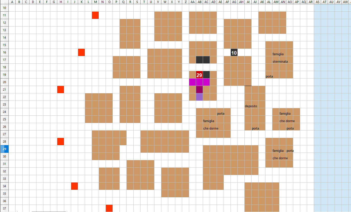 Scatti in strada facendo una finta che spezza l'attenta difesa del lucertoloide che scegli come bersaglio. All'ultimo cambi la traiettoria del colpo infilzandogli una coscia con gli artigli. L'acido scioglie scaglie e muscoli. Il rettile urla e indietreggia zoppicando senza perderti di vista da dietro il suo rudimentale scudo di legno. Dai tetti piovono reti da pesca. La mira del nemico è eccellente ma la tecnica penosa. Le reti di corde non si aprono nel modo corretto scivolandoti addosso. Dai vicoli in basso arrivano rinforzi per il nemico. Ti basta un occhiata per capire che sono guerrieri esperti. I loro corpi segnati da vecchie ferite e gli sguardi senza paura. Dalla cima di una capanna si affacciano due lucertoloidi che attirano subito la tua attenzione. Ansimano per la corsa appena fatta. Uno è particolarmente alto e muscoloso. Al collo indossa una collana fatta con denti di coccodrillo. Ha lo sguardo intelligente, i suoi occhi analizzano la situazione con freddezza. Ti senti quasi giudicato. Il suo volto è molto familiare. Lo hai già visto in cima alla scarpata sulle montagne vicine al tuo rifugio distrutto. Alle sue spalle un rettile che indossa una gonna di foglie colorate di azzurro. E' la prima volta che vedi qualcuno di loro indossare dei vestiti. Le scaglie su braccia e petto sono ricoperte di tatuaggi. Ti indica e dice qualcosa che non capisci. L'altro che è arrivato con lui risponde sibilando verso di te. Azioni Zurgug movimento no AdO da nemico in difesa totale e artiglio 13+9= 22 colpito 1d6+2d4+5= 10 danni AE18 passetto in AE17 AC18 movimento in AE18 e difesa totale Z18 passetto in Z17 e difesa totale Y17 lancia su zurgug rete 17-3= 14 mancato Y18 lancia su zurgug rete 19-3= 16 mancato Veterani doppio movimento Capovillaggio doppio movimento L. tatuato doppio movimento Ordine iniziativa: Lucertoloidi Capovillaggio (viola scuro) L. tatuato (lillà) Veterani (rosa) Zurgug 4/62 ferite [5 uccisioni furtive, 1 lucertoloide] <- tuo turno