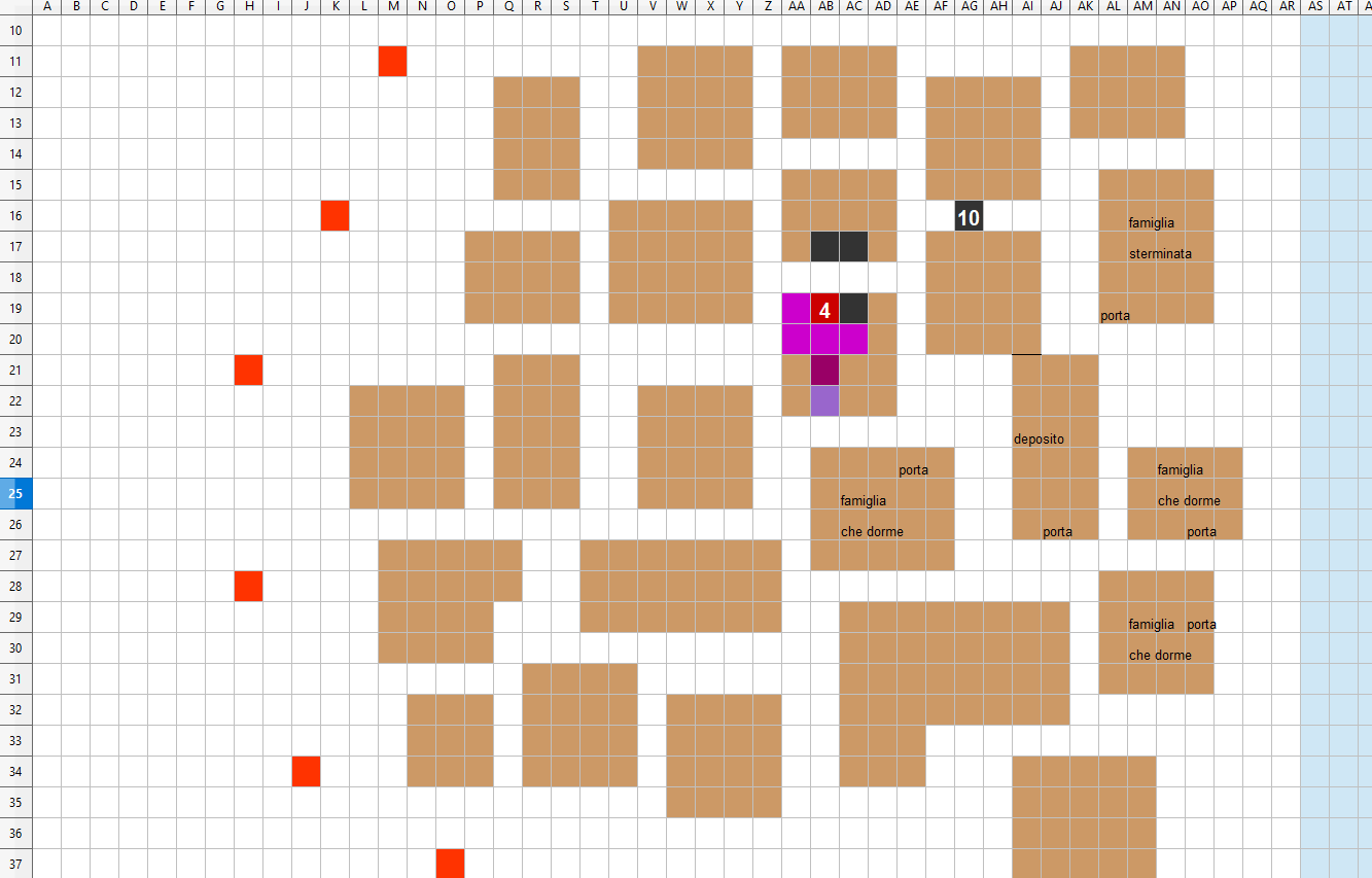 Scatti in strada facendo una finta che spezza l'attenta difesa del lucertoloide che scegli come bersaglio. All'ultimo cambi la traiettoria del colpo infilzandogli una coscia con gli artigli. L'acido scioglie scaglie e muscoli. Il rettile urla e indietreggia zoppicando senza perderti di vista da dietro il suo rudimentale scudo di legno. Dai tetti piovono reti da pesca. La mira del nemico è eccellente ma la tecnica penosa. Le reti di corde non si aprono nel modo corretto scivolandoti addosso. Dai vicoli in basso arrivano rinforzi per il nemico. Ti basta un occhiata per capire che sono guerrieri esperti. I loro corpi segnati da vecchie ferite e gli sguardi senza paura. Dalla cima di una capanna si affacciano due lucertoloidi che attirano subito la tua attenzione. Ansimano per la corsa appena fatta. Uno è particolarmente alto e muscoloso. Al collo indossa una collana fatta con denti di coccodrillo. Ha lo sguardo intelligente, i suoi occhi analizzano la situazione con freddezza. Ti senti quasi giudicato. Il suo volto è molto familiare. Lo hai già visto in cima alla scarpata sulle montagne vicine al tuo rifugio distrutto. Alle sue spalle un rettile che indossa una gonna di foglie colorate di azzurro. E' la prima volta che vedi qualcuno di loro indossare dei vestiti. Le scaglie su braccia e petto sono ricoperte di tatuaggi. Ti indica e dice qualcosa che non capisci. L'altro che è arrivato con lui risponde sibilando verso di te. Azioni Zurgug movimento no AdO da nemico in difesa totale e artiglio 13+9= 22 colpito 1d6+2d4+5= 10 danni AE18 passetto in AE17 AC18 movimento in AE18 e difesa totale Z18 passetto in Z17 e difesa totale Y17 lancia su zurgug rete 17-3= 14 mancato Y18 lancia su zurgug rete 19-3= 16 mancato Veterani doppio movimento Capovillaggio doppio movimento L. tatuato doppio movimento Ordine iniziativa: Lucertoloidi Capovillaggio (viola scuro) L. tatuato (lillà) Veterani (rosa) Zurgug 4/62 ferite [5 uccisioni furtive, 1 lucertoloide] <- tuo turno