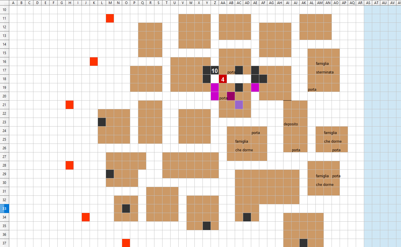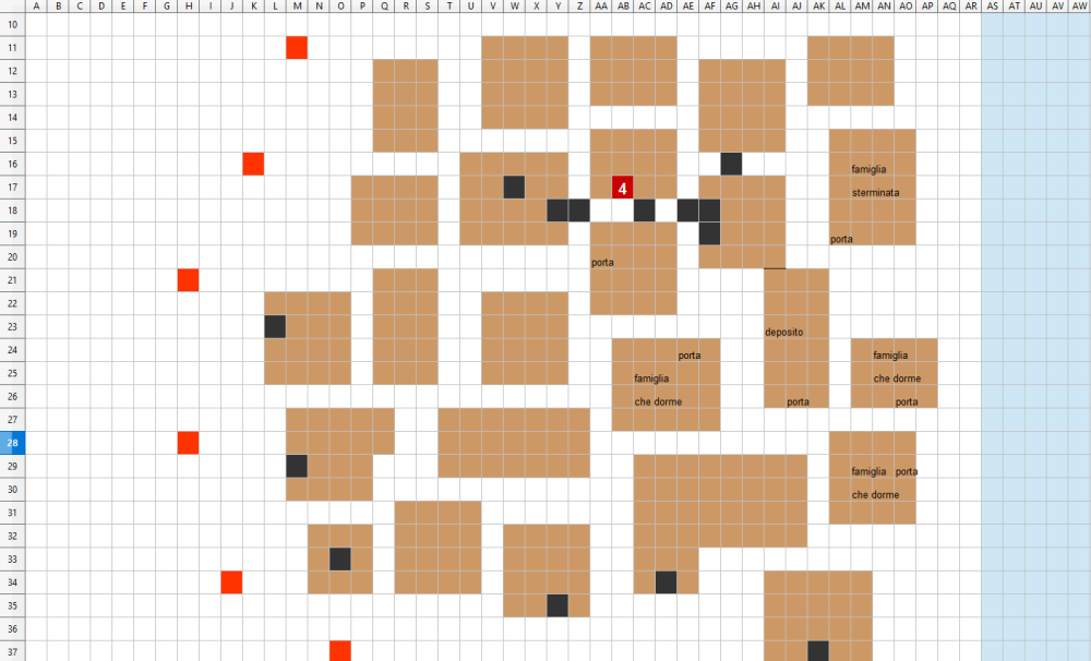 Scatti in strada facendo una finta che spezza l'attenta difesa del lucertoloide che scegli come bersaglio. All'ultimo cambi la traiettoria del colpo infilzandogli una coscia con gli artigli. L'acido scioglie scaglie e muscoli. Il rettile urla e indietreggia zoppicando senza perderti di vista da dietro il suo rudimentale scudo di legno. Dai tetti piovono reti da pesca. La mira del nemico è eccellente ma la tecnica penosa. Le reti di corde non si aprono nel modo corretto scivolandoti addosso. Dai vicoli in basso arrivano rinforzi per il nemico. Ti basta un occhiata per capire che sono guerrieri esperti. I loro corpi segnati da vecchie ferite e gli sguardi senza paura. Dalla cima di una capanna si affacciano due lucertoloidi che attirano subito la tua attenzione. Ansimano per la corsa appena fatta. Uno è particolarmente alto e muscoloso. Al collo indossa una collana fatta con denti di coccodrillo. Ha lo sguardo intelligente, i suoi occhi analizzano la situazione con freddezza. Ti senti quasi giudicato. Alle sue spalle un rettile che indossa una gonna di foglie colorate di azzurro. E' la prima volta che vedi qualcuno di loro indossare dei vestiti. Le scaglie su braccia e petto sono ricoperte di tatuaggi. Ti indica e dice qualcosa che non capisci. L'altro che è arrivato con lui risponde sibilando verso di te. Azioni Zurgug movimento no AdO da nemico in difesa totale e artiglio 13+9= 22 colpito 1d6+2d4+5= 10 danni AE18 passetto in AE17 AC18 movimento in AE18 e difesa totale Z18 passetto in Z17 e difesa totale Y17 lancia su zurgug rete 17-3= 14 mancato Y18 lancia su zurgug rete 19-3= 16 mancato Veterani doppio movimento Capovillaggio doppio movimento L. tatuato doppio movimento Ordine iniziativa: Lucertoloidi Capovillaggio (viola scuro) L. tatuato (lillà) Veterani (rosa) Zurgug 4/62 ferite [5 uccisioni furtive, 1 lucertoloide] <- tuo turno