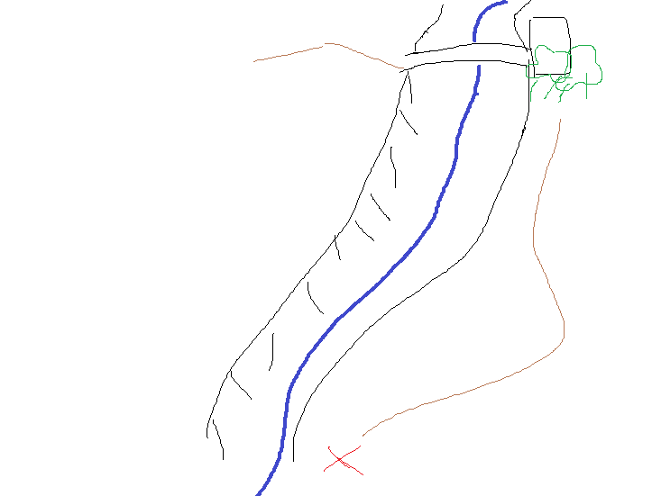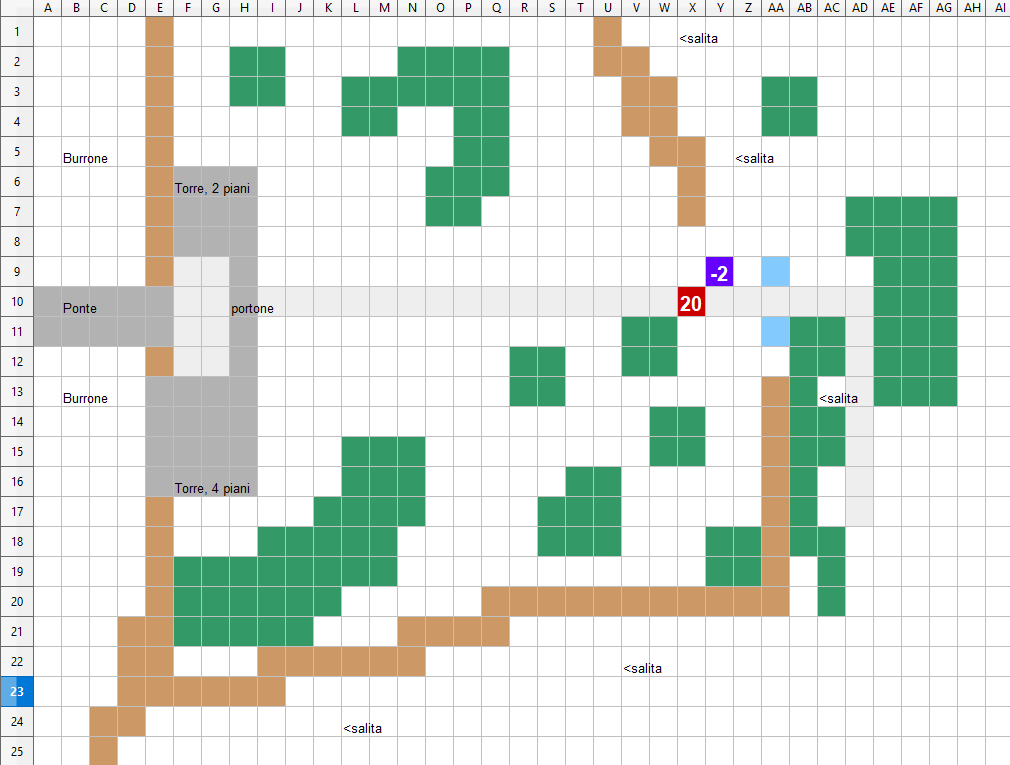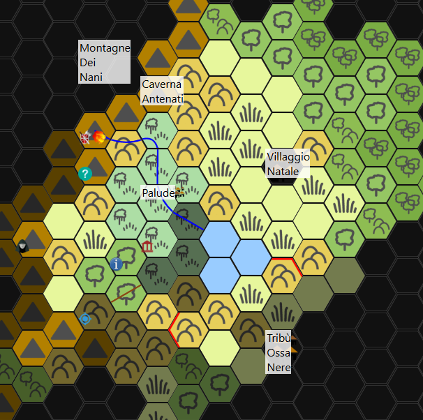 Sei una brava persona, ci hai salvato la vita e trattato con rispetto. Un orco veramente peculiare. Puoi stare certo che una volta a casa lo racconteremo a tutti. Se lascia la stessa impressione in tutte le persone che incontri sono sicuro che sentiremo presto parlare di te! Avvento lo scambio Baggi ti salta addosso e ti riempie il collo di baci. L'ultimo giorno si è appassionata di quella insolita arma dei piccoli uomini e sperava proprio di averne una tutta sua. Gli Halfling ridono di gusto alla scena. Giorno 35 dalla distruzione del villaggio. [Zurgug 28/76 ferite] Il mattino seguente vi svegliate tutti molto presto. I mezzi uomini preparano le loro cose e ripiegano la tenda. Vi salutate e prendete strade diverse con un po' di tristezza nel cuore. Prima di separarvi Alton vi lascia 10 razioni da viaggio. Casella 2 CD 17 Montagne 16+9= 25 successo [Tempo di viaggio totale 4 ore] Vi infilate tra le montagne. Il terreno scosceso e irregolare ti costringe a navigare nei pochi sentieri disponibili. Dopo aver analizzato bene il terreno ti rendi conto che devi per forza passare nella gola dove hai salvato i piccoli uomini. A terra sono ancora sparsi i cadaveri in decomposizione dei ragni. Zio Alton ci ha raccontato tutto! Dice il bimbo maggiore spostando con la lancia le lunghe zampe del ragno più grande. Il più piccolo gli corre intorno con le braccia in aria. Sei un eroe! Zurgug! Zurgug! Nonostante l'entusiasmo iniziale mentre attraversate il passo siete molto tesi. Fortunatamente nessun ragno scende dalle pareti rocciose. Forse li hai uccisi tutti, forse sono abbastanza intelligenti da sapere che è meglio lasciarti stare. Il sole è quasi allo zenit quando giungete sulla riva di un fiume che serpeggia tra due pareti rocciose alte almeno 30 metri. Devi attraversarlo ma scalere le pareti della montagna è un impresa difficile per te, per gli altri sicuramente una condanna a morte. Cercare (gruppo, uso il più alto) Baggi CD 10 - 15+2= 17 successo Forse però c'è un altro passaggio. Il sentiero prosegue verso l'alto e sembra anche trafficato assiduamente. Guardando bene in quella direzione Baggi ti fa notare che mezza nascosta tra le piante, proprio a ridosso della scarpata, c'è una torre di pietra e si intravede anche un ponte. In linea d'aria la torre è a circa 500 metri e ci sono parecchi ostacoli visivi in mezzo non rappresentati. Il sentiero e tortuoso. Ma io non so disegnare. Voi siete sulla x rossa.