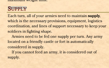 Consumano tanti supply quanto il loro “weight”, a meno che non siano in un castello Puoi benissimo tenerle tutte in riserva, per non consumare risorse, ma puoi spostare solo una unità dall’esercito alla riserva per stagione