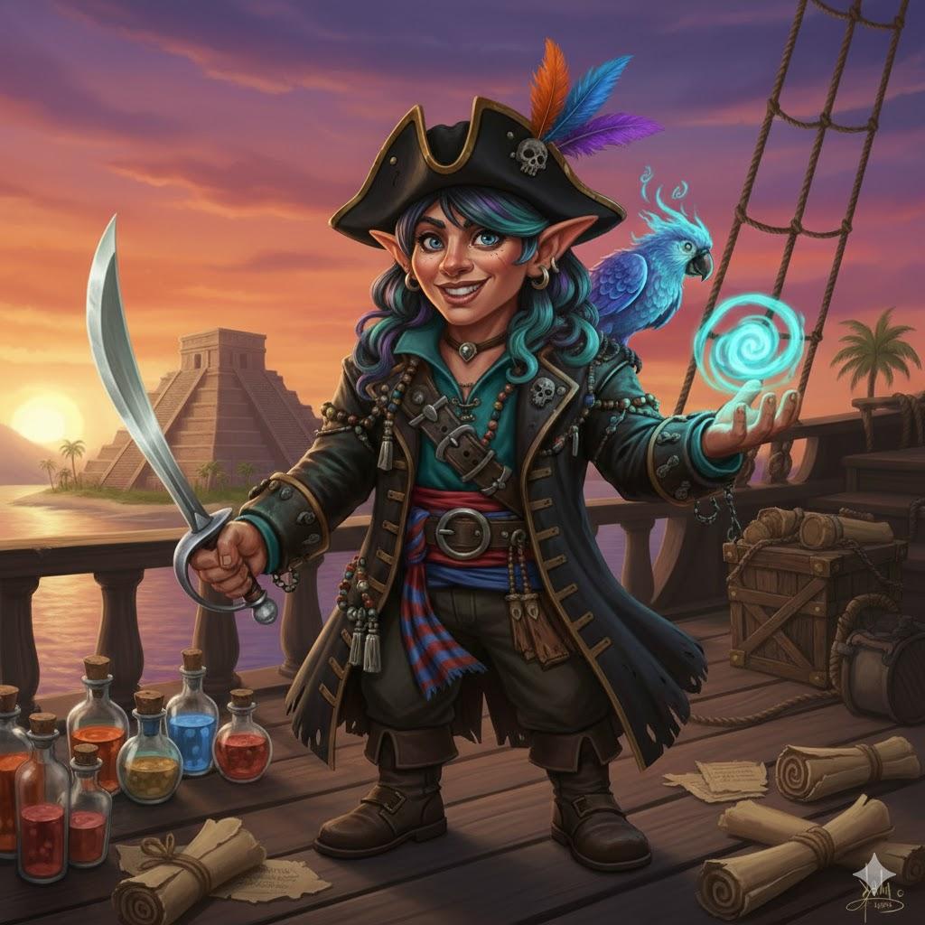 Fandango16 ha risposto a Steven Art 74 a un discussione Topic di Servizio in I Corsari della Costa della SpadaNon vorrei che Adva la gnoma debba usare un'arma bianca. Avrà un normalissimo pugnale per le cose quotidiane, ma nella furia della battaglia scaglierà i suoi malefici a chiunque la minacci (senza problemi grazie a Esperto di Balestre!) per poi cercare di dominare direttamente il campo di battaglia. Se proprio vogliamo lavorare su un oggetto magico, lavoriamo sul teschio rosa o sullo scudo meccanico sul braccio che invece mi piacciono molto! Il teschio rosa sarà il suo focus materiale non consumabile per il suo incantesimo più potente nel repertorio "Summon undead" con il quale richiama a sé un potente spirito che combatte per lei (magari uno spirito conosciuto dal teschio?). Lo scudo invece è il suo sistema di protezione dalle randellate, sciabolate, pugnalate tipici della battaglia! Metto un'immagine costruita con Gemini dove ha una scimitarra che non c'entra niente, però il resto mi piaceva. Sarebbe bello anche che avesse un tricorno da vero pirata! Magari potremmo lavorare su quello...se fosse un "tricorno del camuffamento" per fuggire dai suoi acerrimi nemici e per infiltrarsi in anonimato?