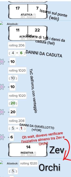 Alzabuk ha risposto a Alzabuk a un discussione Regole generali, confronti e preparazione dei PG in La caduta del RutzbekistanEsatto! FOR atletica ler scalare e scavalcare il ponte (che è quasi in verticale e che ti hanno lasciato aperto). DEX acrobazia per diminuire di 1d6 il danno da caduta CD 13 (il manuale non prevede di per sé la possibilità di dimezzare i danni da caduta o ridurli altrimenti; valuto quandi a seconda dei casi. In questo ho calcolato CD 10+(altezza/2 arrotondata per eccesso) = CD 13 essendo possibile che scivolassi in modo sicuro e controllato per almeno 5m; un successo clamoroso avrebbe ridotto ulteriormente i danni). Gli orchi hanno mirato con vantaggio, poiché Zev era appeso, esposto di spalle e con poca mobilità. 😉