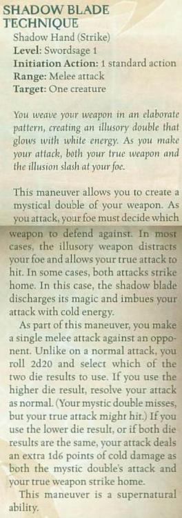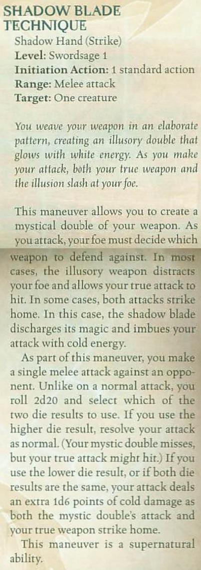 Mako Mori Fianco a fianco con Freya attacco l'oni alla mia sinistra (R10) così da colpirlo contemporaneamente da due fronti e abbatterlo velocemente per poi passare all'altro. Dietro di me sento la presenza di Hattori @Melqart per cui non mi preoccupo troppo del nemico alla mia destra, ci penserà lui ad ingaggiarlo e tenerlo occupato, dopotutto mi sembra un ragazzo decisamente affidabile. Concentro il mio Qi e lo incanalo nella mia lama, in una delle mie tecniche favorite: "ARTE DELL'OMBRA - Lama fantasma". Alla mia destra compare una copia esatta della mia arma ma, oltre a galleggiare minacciosa a mezz'aria, è completamente nera e avvolta da un leggero fumo nero che le dona un aspetto sinistro. Con entrambe le lame rivolte al mio attuale avversario lo attacco con impeto, la lama d'ombra mira al viso, mentre io mi abbasso sulle gambe per accorciare la distanza e cercare di entrare nella sua difesa colpendolo dal basso, dritto al ventre. DM @Albedo Island of Blades (Posizione): garantisce fiancheggiamento (+2TC) sui nemici che sono minacciati da me e da un altro alleato. Valido sia su di me sia sull'alleato. SEMPRE ATTIVA TC: +6+2 (canto) +2 (fiancheggiamento)= +10 IN BREVE: attacco con entrambe le armi e tiro 2d20. Se scelgo il minore dei risultati il nemico subisce 2 attacchi, altrimenti solo 1 (se il maggiore basta a colpire). *se il più basso colpisce scelgo quello altrimenti prendo il maggiore. Grazie Danni: Attacco base = 1d6+2 Attacco lama ombra = 1d6 da freddo