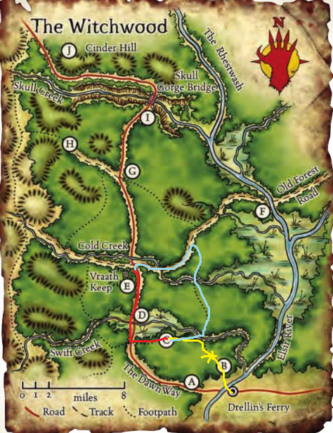 Il boscaiolo fa un breve sorriso. I suoi denti si vedono appena sotto la barba folta. Pronti a rischiare la vita per il villaggio ma non a pagare un servizio eh? Coraggiosi ma spilorci. Si accarezza la barba e aggiunge. Andata e ritorno sono due giorni di lavoro dove rischio la pelle e non mi ci esce nemmeno il denaro per comprare una pozione di cura se vengo ferito. Poi vienimi a dire che mi approfitto ragazzina. Si volta e spinge la porta con una mano. Facciamo i conti alla fine, ora entrate va', vi offro pure il pranzo. Non aspettavo ospiti ma qualcosa da mangiare c'è sempre. Tutto fatto da me ovviamente. Dice con una punta di orgoglio. L'interno della piccola capanna è piuttosto spoglia. Un pagliericcio, un paio di grossi bauli, un tavolo e uno sgabello vicino al fuoco. Qualche mensola che straborda di utensili da cucina e piatti. Mette sul tavolo due bicchieri di coccio. Ho solo questi purtroppo. Dovremo condividere. E tira fuori una bottiglia di vino da un baule. Toglie il tappo, la annusa Ancora buono e la porge a Jorgen. Poi stende un panno quasi pulito e ci dispone sopra salsicce di cinghiale e pane secco. Servitevi pure, il coltello è laggiù. Tra poco sarà pronta anche la zuppa di pesce che ho sul fuoco ma la stavo facendo solo per me, è poca per sfamare tutti. Verrà fuori poco più di un assaggio. Sono pesci di palude, saporiti ma non in modo troppo piacevole. Bisogna farci il palato per goderseli. I cani si fermano all'uscio e non entrano. Mentre mangiate Jorr vi presenta due alternative. La più veloce. Circa mezza giornata di cammino. (strada rossa) Passa attraverso la palude. Finché si percorre la via dell'alba la palude non è troppo pericolosa ma non si possono escludere sorprese. Nelle acque nere ci sono sempre pericoli in agguato. Basta un piede in fallo, o un pizzico di sfortuna, per finire male. La strada più lunga e difficile da praticare. (strada celeste) 3/4 di giornata a piedi. Più sicura della palude ma non esente da pericoli nascosti. Quale strada volete prendere?