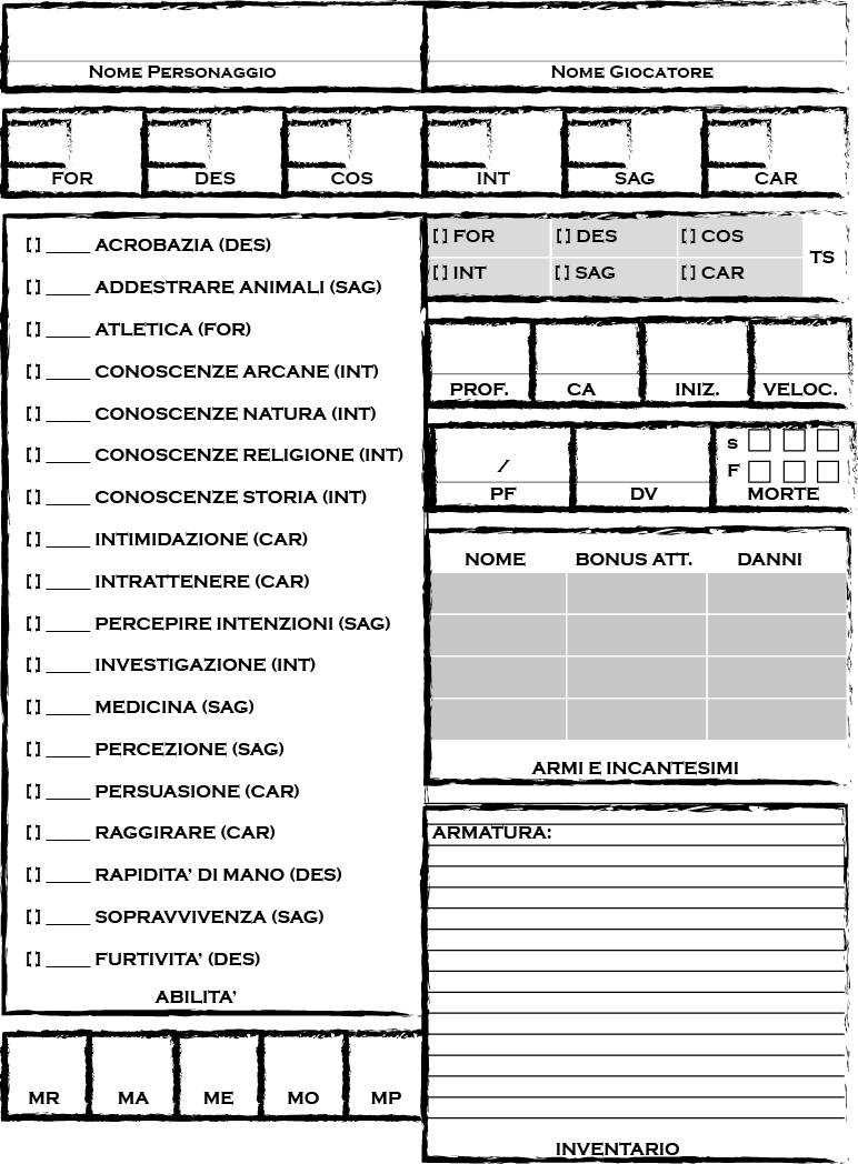 Scheda del Personaggio per D&D 5 in italiano. Gli incantesimi sono divisi su più pagine (4Lv/Pag).