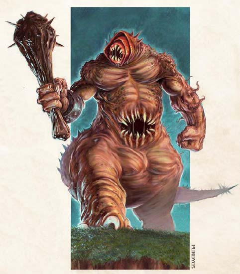 Questa creatura è più alta di un gigante delle colline, ma è molto tarchiata, con gambe massicce e una coda. Invece di una normale testa e di un volto, la sua schiena spinosa termina in un orifizio contenente una bocca irta di denti.