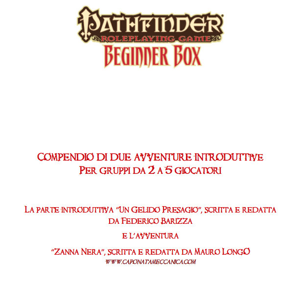 NB: l’idea di questo sussidio introduttivo è, come spiegato, quella di collegare due avventure differenti. Non è tuttavia necessario aver giocato il Dungeon di Zannanera per poter utilizzare questo modulo, basterà modificare opportunamente la Scena 1 e rimuovere i riferimenti alla precedente avventura.