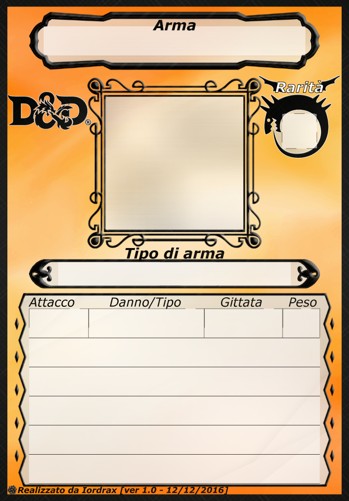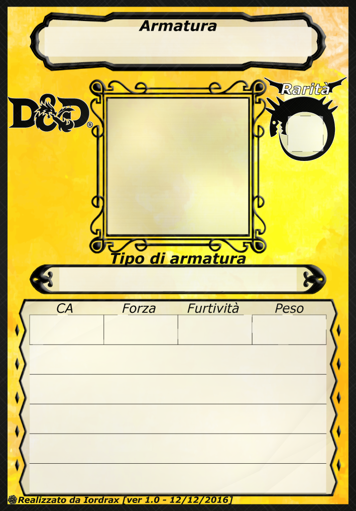 volevo condividere con voi delle carte che ho realizzato per la mia prossima sessione, ho preso spunto dalla scheda pg editabile ed ho creato un set di carte editabili dove poter annotare tutte le caratteristiche dell'abilità/arma/armatura/incantesimo/oggetto magico, è possibile inserire anche delle immagini (consiglio come dimensione 280x270).
