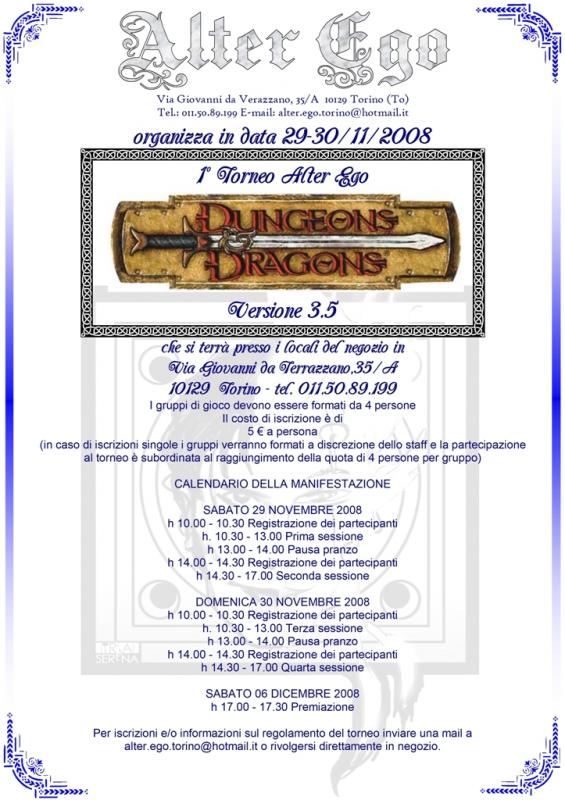 24 Novembre 200817 anni comment_273003 Vedo con piacere che si puo' postare eventi e tornei... Ne approfitto per informarvi che a Torino il 29-30 Novembre 2008 si svolgerà presso il negozio Alter Ego di Via G.da Verazzano 35/a un Torneo di D&D 3.5 di cui allego la locandina, per info e iscrizioni è spiegato tutto dettagliatamente sulla locandina.... ... partecipate numerosiiii Segnala