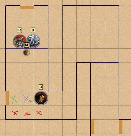 5 Settembre 200916 anni comment_361114 Prima di andare, Meepo da un'occhiata a quella porta per vedere se è pericolosa dico indicando la porta a sud-ovest State pronti, sisi. Non si sa mai Spoiler: Di base farò sempre così quando vado a controllare una porta: prima controllo le 2 caselle prima della porta ( a meno che qualcuno non ci sia già passato ) e poi la porta. Ho allegato l'immagine: Mi metto nella casella in cui è segnato Jerl ( si può cercare fino a 10ft -3m- di distanza) e prendo 20 per controllare la casella con la X blu ( cercare=31 ) Poi controllo la casella con la X verde ( prendo 20: cercare=31 ) Restando a 3m lontano dalla porta, faccio l'ultima prova di cercare sulla porta stessa. Anche qui prendo 20 ( 31). In tutto ci metto 6 minuti. Se mi sembra tutto sicuro, avvicino l'orecchio alla porta e faccio anche una prova di ascoltare ( ascoltare +4 ) Segnala