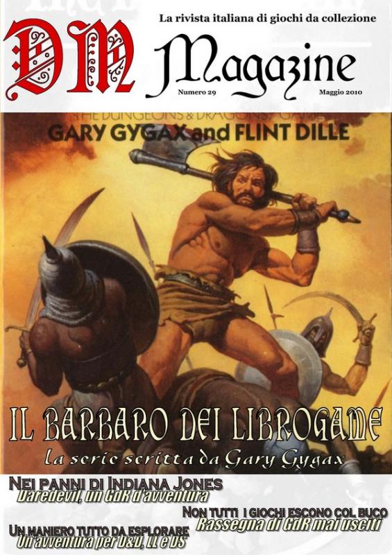 Pubblicato 26 Maggio 201015 anni comment_479834 COMUNICATO STAMPA 014 DISPONIBILE DM MAGAZINE 29! Il nuovo numero di DM Magazine – La rivista italiana di giochi da collezione dedica la copertina a una delle opere minori e quindi meno conosciute del compianto Gary Gygax, co creatore di Dungeons & Dragons Classico e creatore di Advanced Dungeons & Dragons. Ecco il dettaglio del sommario: - “Giocatori invisibili”: Ciro Alessandro Sacco scrive un editoriale che sorprenderà coloro che lo conoscono come un 'pessimista' (o come direbbero altri, 'realista') sulla situazione del gioco di ruolo dal punto di vista diffusionale. Scoprite le sue riflessioni intitolate “Giocatori invisibili”... - “Avventire per temerari”: Gianmatteo Tonci continua la sua esplorazione nel mondo dei giochi di ruolo 'minori' con un piccolo classico della FGU che deve qualcosina al trionfo di Indiana Jones. - “Il barbaro di Greyhawk”: Mauro Longo propone una recensione di una serie di librogame, Sagard il Barbaro, scritta nientemeno che da Gary Gygax e da Flint Dille, una delle opere meno note di uno dei Padri del Gioco di Ruolo - “I giochi che non furono mai”: Ciro Alessandro Sacco si occupa in questo articolo di tutti (o quasi) i giochi di ruolo (e perfino una rivista o due) e di una serie di espansioni che furono annunciate da editori italiani e non videro mai la luce. Un articolo iniziato come una curiosità che non ha fatto che crescere sempre di più. Preparatevi a grosse sorprese! - “Il Maniero di Selinun”: e dopo tutta questa parte saggistica, ecco arrivare (come richiesto da piùparti) del materiale giocabile, ovviamente in chiave retro. Giulio Iannarella ci propone un'avventura per principianti con le statistiche di Dungeons & Dragons Classico, Labyrinth Lord e DungeonSlayers “Uno sguardo al passato” questa volta propone la fotografia di due autori italiani oggi molto affermati che muovevano i loro primi passi nel mondo dell'editoria professionale: scoprite di chi si tratta. - Il numero 29 di DM Magazine potrà essere scaricato qui: http://www.lulu.com/product/a-copertina-morbida/dm-magazine-29/11050725 (a causa dei lavori di rifacimento del sito, il numero 29 non è ancora scaricabile a bassa definizione) Nel negozio virtuale è possibile scaricare gratuitamente il numero e anche ordinare (a prezzo di costo, non esiste alcun ricarico della redazione) una copia stampata della rivista. Attenzione: rispetto alla versione scaricabile su Grottadimerlino.com, la versione di Lulu.com è ad alta definizione! Il numero 30 di DM Magazine (un numero che celebreremo con una sorpresa in pieno stile retro) sarà disponibile dal 25 luglio. Segnala