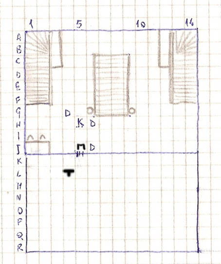 14 Maggio 200619 anni Autore comment_78470 Khraan Con in mano il pesante pezzo di portone, incurante delle schegge che gli graffiavano le mani, il giovane orco si preparò ad attaccare. [(ho considerato lo staccare un pezzo di porta come azione di round completo in cui i drow si sono avvicinati; adesso l'iniziativa è tua) il randello fa 1d8+10 ma c'è una certa percentuale che si rompa.] [MAPPA: K è Khraan, davanti alla porta rotta. D sono i 4 drow, con le lance pronte. Nei due angoli in alto ci sono due scale che scendono (l'ingresso dal piano in cui siete è F1/F2 e F13/F14, da lì vanno verso il basso, girando intorno a B2 e B13); in ABC3 e ABC12 ci sono due armadi, dell'angolo in basso a sinistra c'è un tavolo con due sedie; in G6 e G9 ci sono due colonne che affiancano una parete (in realtà è una scala che va verso l'alto, ma da dove sei non lo puoi capire)] Segnala