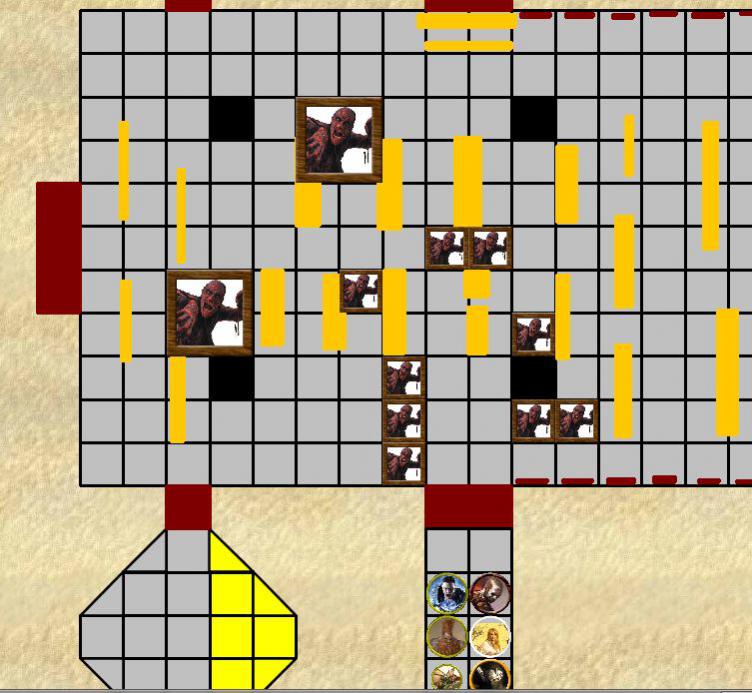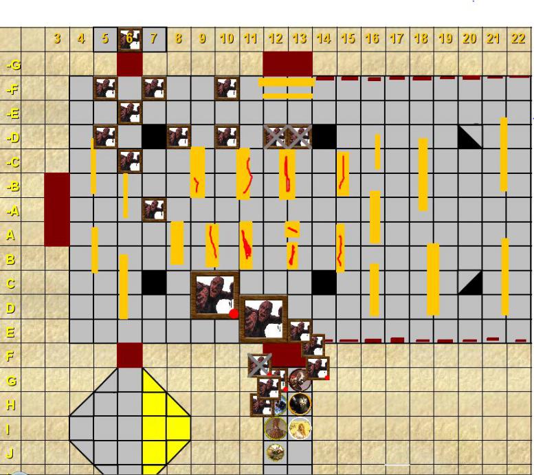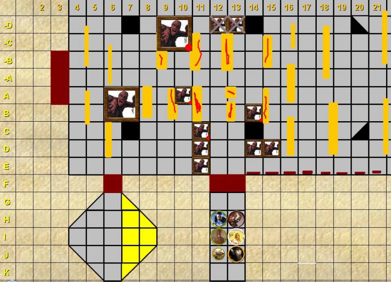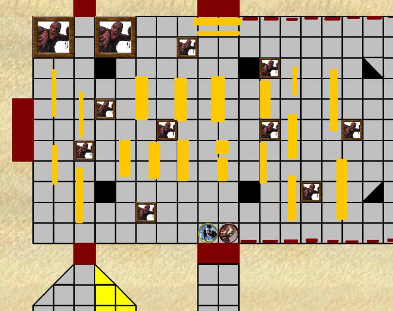 18 Ottobre 201213 anni Autore comment_774552 Ichabod decide di avanzare dietro Iankev che era stato più veloce di lui, preparando al contempo la sua lama. I non-morti, muovendosi come una creatura sola, corrono tutti verso il corridoio dove si trova il gruppo, però...fanno qualcosa che nessuno si sarebbe immaginato. Alcuni si arrampicano sui muri del corridoio, potendo così colpire anche da sopra Iankev e Nim, e addirittura a lato dei muri, come fossero ragni. Quelli che hanno raggiunto il corridoio per primi si accalcano su Nim e Iankev. Uno di loro stava correndo verso Nim sollevando la sua mano ricoperta di sangue, ma Ichabod accanto a lui mena un fendente su di lui, aprendogli la cassa toracica e facendolo crollare a terra schizzando sangue sui presenti. Subito però un altra creatura prende il posto di quella appena abbattuta, e colpisce in pieno Nim con il pugno. Iankev invece viene preso di mira da altre due di quelle creature, ma grazie al suo addestramento e alla sua agilità riesce ad evitare entrambi gli attacchi. Nel frattempo, nuove creature giungono dalla stanza della gemma e non accennano a smettere. Mappa Spoiler: Praticamente è come se in un quadretto ce ne fosse uno normalmente davanti, uno nel quadretto sopra in linea d'aria, e uno in mezzo ai due quadretti. Inoltre, i quadretti rossi che rappresentano le porte non vanno contati, e quindi bisogna considerarli come se non ci fossero, è solo che è difficile segnare le pareti sennò. Iniziativa Spoiler: Si ricomincia. Nim <--- Nim Spoiler: Subisci 4 danni. Segnala