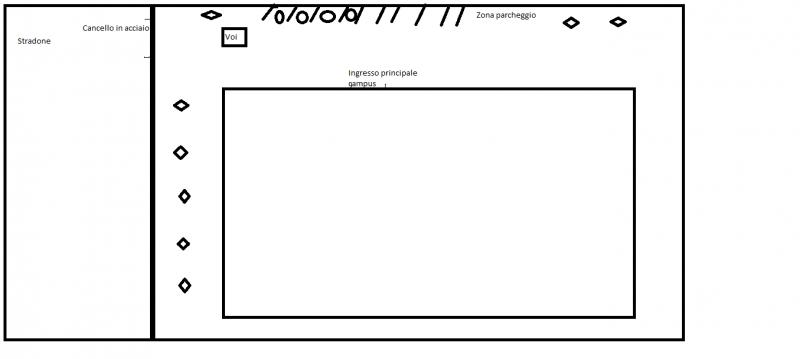 16 Novembre 201212 anni Autore comment_784011 Spoiler: Mi piace come state ruolando ragazzi, giusto qualche appunto. D'ora in poi per ogni luogo che visiterete vi farò il disegno, così che possiate narrare bene la scena. In secondo luogo se volete fare azioni di qualche tipo me lo dovete mettere sotto spoiler. Esempio: Spoiler: Vado in avanscoperta per 10 metri e all'angolo giro a destra con la pistola puntata davanti a me, muovendomi silenziosamente Mappa: Allora i triangoli sono alberi, il cancello in acciaio è da dove siete entrati ed è semiaperto, gli ovali sono auto parcheggiate,le strisce rappresentano i parcheggi e l'ingresso è fatto da un sistema di vetrate che scorrendo e riconoscendo che ci sono persone si dovrebbe aprire, la parte sud e ovest del campus sono sconosciute. Il campus è circondato da un muretto di cemento di 1 metro su cui si eleva una cancellata solida di 1,5 m, che consente di vedere all'esterno. il muretto è rappresentato dai rettangoli più esterni Segnala