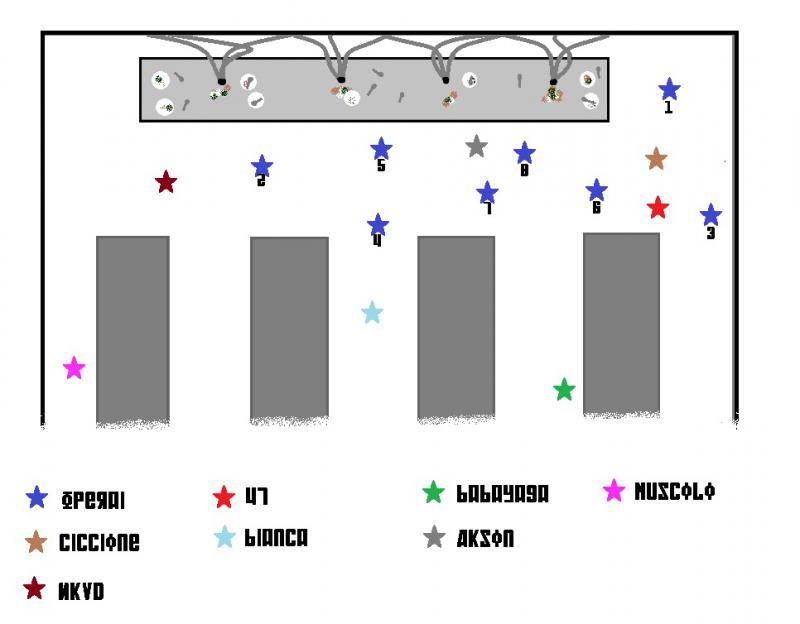 8 Settembre 201312 anni Autore comment_875432 Visti i disordini che si sono creati, gli operai non coinvolti nella rissa si allontanano velocemente dalla zona per non essere presi di mira dalle guardie che stanno arrivando. @Akson: Provi a divincolarti per sfuggire alla scazzottata ma mentre ti fai strada, una gomitata ti colpisce alla tempia lasciandoti stordito e incapace di muoverti. Spoiler: Intrufolarsi 7, estrazione = fante = fallimento critico @Bianca e 47: Spoiler: risoluzioni: bianca =26, 47=27: inizia 47 @47: Ti avvicini deciso al ciccione senza guardare gli altri, lui sta gridando e insultando tutti. Sta per rivolgersi a te quando un pugno preciso e forte come un pistone lo colpisce in piena faccia. Gli hai rotto il naso e il labbro superiore, lo vedi urlare come una scrofa mentre si tiene la faccia con le mani lorde di sangue. Ti giri a guardare gli operai che lo circondavano e loro fanno un passo indietro intimoriti (i numeri 1,3 e 6 in figura). Spoiler: rissa 10, estrazione 3 = successo. Zona colpita la morte (testa) danni 4-1= 3 @Bianca: Ti avvicini al primo operaio i(l numero 4 in figura)e gli assesti un colpo preciso al braccio sinistro. Quello si gira pronto a combattere, ma quando vede che sei una guardia desiste e si allontana risentito stringendosi il braccio colpito. Ti guardi intorno e vedi un operaio stordito che fatica a reggersi in piedi (il grigio in figura) vicino a due operai che se le stanno dando di santa ragione (i numeri 7 e 8 in figura). Spoiler: rissa 7, estrazione 2= successo. Zona colpita le stelle (braccio sinistro) danni 3-1=2 @Babayaga: Osservi divertita gli operai che scappano come ratti davanti a un gatto per paura delle guardie, ti sembra uno spettacolo divertente quando la tua attenzione si sposta casualmente su un operaio che perde un oggetto dalla tasca mentre si allontana dalla rissa correndo. @Usignolo: Te ne stai seduto nella tua cella a cantare quando improvvisamente il tuo amico 85 riapre la cella dandoti un'ottima notizia: "Potete uscire! C'è stata una rissa nella mensa e le celle ci servono per gli operai coinvolti, quindi vi fanno uscire!" Mentre ti parla slaccia le tue manette e ti accompagna all'ingresso della centrale dove 899 ti aspetta sorridente. 85 vi lancia un saluto e corre verso la mensa con altri due soldati. La tua amica ti dice "Andiamo a vedere se troviamo qualche avanzo?"E' una cosa che fate spesso visto che a volte vi rubano il pranzo. @Muscolo: Te ne stai in disparte a mangiare il tuo pasto, cerchi di tenere d'occhio la tua amica gatta quando ti rendi conto che in realtà non l'hai più vista da oggi pomeriggio. A cena non c'era e non è da lei. Inizi a preoccuparti... Segnala