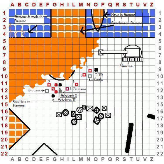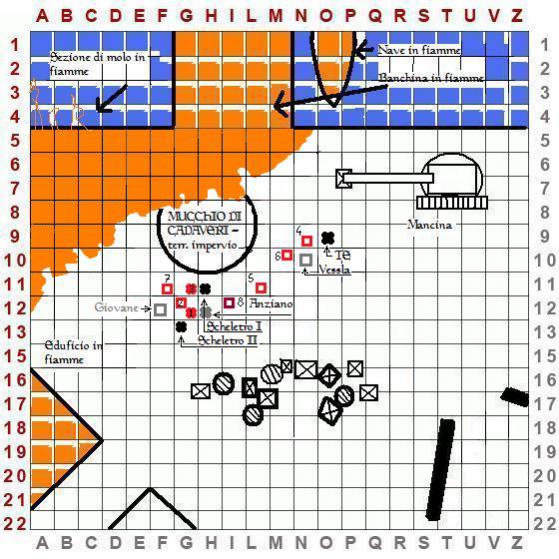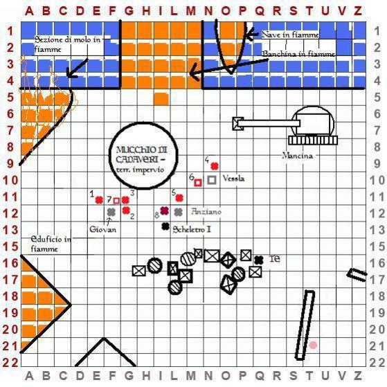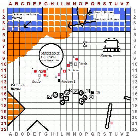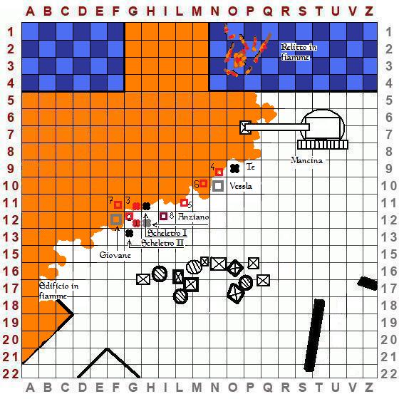 4 Settembre 201312 anni Autore comment_874678 Poche parole, ma pregne di oscura potenza, accompagnano i tuoi gesti rituali, mentre la battaglia infuria. Lo scheletro che hai evocato poc'anzi tenta un colpo contro la creatura che gli hai ordinato di attaccare. La mazza arrugginita si abbatte contro la schiena dell'abominio, conficcando le spine di ferro nella corazza e risuonando come un bastone sulla pelle di un tamburo. Il bestione corazzato cade a terra di faccia, restando immobile e sanguinante. Vessla è riversa al suolo, col sangue che sgorga dalla ferita e la vita che pian piano l'abbandona. Il mostro si nutre della sua carne fresca, strappandola con morsi avidi. Il guerriero anziano mena un colpo di spadone al suo nuovo avversario, aprendogli il corpo dallo sterno alla coscia. Sangue e budella si riversano al suolo con un suono simile ad un risucchio d'aria. L'anziano urla di furore, poichè nota lo scempio che si sta perpetrando sul corpo di Vessla, quando il mostro crolla davanti a lui, lasciando libera la visuale e abbandona lo scontro con il nemico corazzato, ormai abbattuto, per muoversi verso Vessla. Intanto il giovane è alle prese con tre avversari, che lo incalzano con le loro rozze asce. Come temevi, la sua fortuna non poteva arridergli in eterno. Una violenta asciata lo colpisce al fianco, costringendolo a piegarsi di lato urlando di dolore. A rincarare la dose il fetido essere alla sua destra lo colpisce alla testa, ammaccando l'elmo e, probabilmente, sfondando il cranio. La terza asciata è del tutto superflua, e manca il bersaglio, poichè il bersaglio è crollato a terra senza un gemito. Intanto l'incendio si propaga a vista d'occhio, arrivando a lambire il mucchio di cadaveri. Spoiler: Tocca a te e compare lo scheletro. Vessla è esmpre distesa a terra, incoscente. N°4 nè divora le carni. Il tuo scheletro abbatte N°8 (il corazzato), mentre il guerriero anziano manda a terra senza forze N°5 e si sposta da L12 a M10. Il guerriero giovane viene colpito dalle asce di N' 1 e 2, mentre N°3 manca il bersaglio. Il giovane crolla a terra senza conoscenza. Segnala
