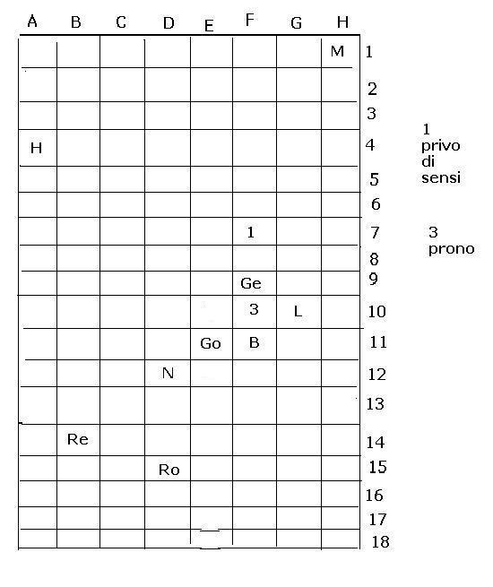 25 Novembre 20159 anni Autore comment_1140568 Geobaldi attua la sua mossa letale. L'effetto è devastante e il nemico cade a terra esanime. Geobaldi torna visibile. L'hobgoblin7 fa un passo e attacca il barbaro, ma lo manca. Il capo dei nani si avvicina al 9, e pure lui manca. Così non fa proprio 9, che fa un passo e colpendo Gorstag, gli procura qualche danno (-4pf) Spoiler Ho provato a far qualcosa con paint, ma accetto consigli su siti per fare una mappa in velocità (questo è requisito essenziale) Iniziativa: (tocca a Gorstag) Roscoe 22 Reekda con Roy 20 (Roy 11/13 pf) Beorn 19 (27/36 pf) Mihnalya 17 (15/17 pf) Geobaldi 13 Hobgoblin 7 12 Capo dei nani 11 Hobgoblin 9 11 (-8pf) Gorstag 9 (28/44 pf) Hobgoblin 3 6 (-14pf) (prono) Hobgoblin 1 5 (privo di sensi) Segnala