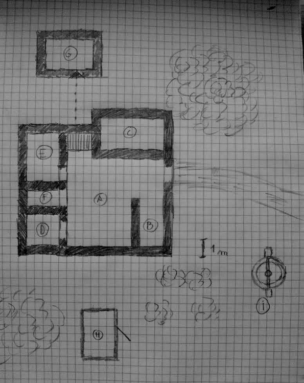 16 Settembre 201411 anni Autore comment_983474 LA CASA A. Salotto; tavolo centrale; camino su parete sud; scale su parete nord. B. Cucina. C. Stanza da letto doppia; in passato fu uno studio; ampia scrivania. D. Stanza da letto; Jonathan finora E. Stanza da letto meno spartana; Zachary finora. F. Bagno. G. Piccola cantina. H. Piccolo casotto esterno. I. Pozzo. #Zachary Spoiler: Nella piccola cucina v'è una dispensa i normali cibi base, condimenti molto semplici e articoli da apparecchiamento. Le spartane scale in pietra in salotto, poi, conducono ad una piccola stanza, che in questa casa è tuttora utilizzata come risicata dispensa. Qui ci sono alimenti a lunga conservazione, come carne secca, pesce salato, un pò di vino e olio. Segnala