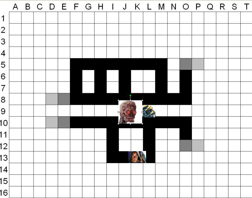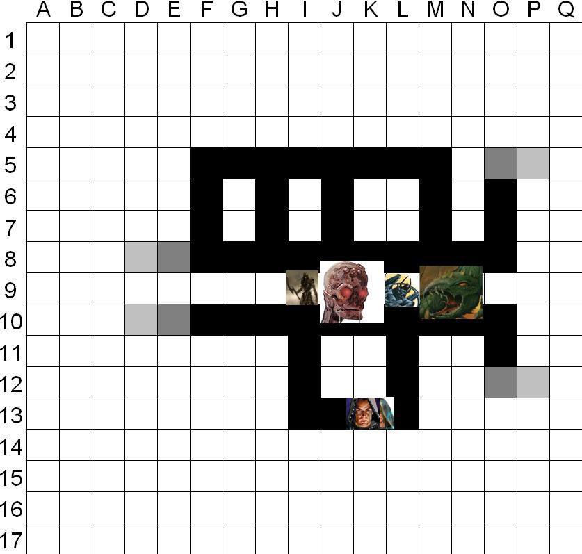 12 Ottobre 201510 anni Autore comment_1125542 Breeze Le due mummia fanno qualche passo, ma rimangono nella sala dei serpenti, fuori dalla vostra vista. La mummia col disco se lo porta di nuovo alla testa, si concentra e poi risoluto lo lascia appoggiato alla base di una colonna. Estrae un Khopesh da un fodero e si pianta sul pavimento polveroso, pronta ad aspettare gli eventi. L'altra pure sembra mettersi in attesa di qualcosa. Tutti Va bene la vostra disposizione? A sinistra c'è la sala dei serpenti, a destra quella del muro illusorio. Airees è quello che sta dietro a Breeze. Malgrado lo indichi di un solo quadretto, il corridoio in realtà è largo 2m e spiccioli, quindi le creature di taglia grande possono passare senza problemi (a meno di essere più larghi che lunghi) Segnala