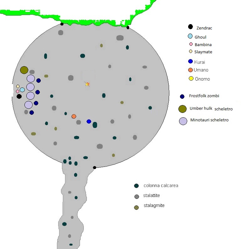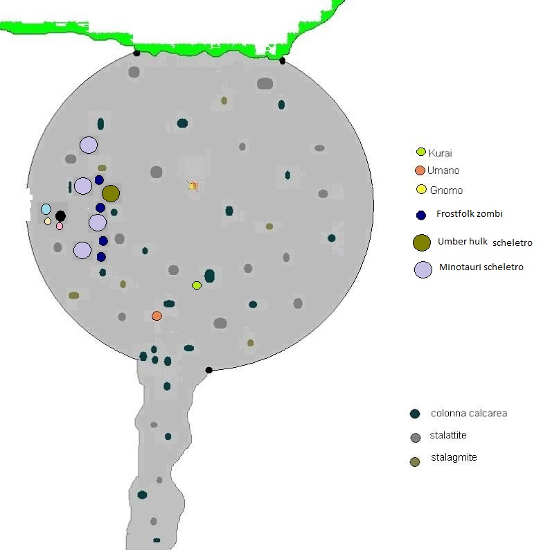 19 Marzo 201510 anni Autore comment_1051866 @ Kurai Spoiler: Fai qualche metro e senti un grido soffocato provenire da sopra di te , alzi la testa e a fatica e solo perche si sta muovendo vedi lo gnomo e la cosa che lo sta trattenendo..sembra una specie di enorme polipo , col corpo gonfio e molliccio dello stesso colore delle pareti della grotta , puoi notare quattro grossi tentacoli uno dei quali è attorcigliato attorno allo gnomo , capisci che è lo gnomo dagli stivali , l'unico pezzo di lui libero dal tentacolo , il tentacolo si sta velocemente avvicinando ad una bocca irta di denti aguzzi , mentre guardi la creatura schivi per un soffio un altro tentacolo che mirava alla tua testa ....fai un salto indietro ed aumenti le tue dimensioni...appena fatto questo un la caverna comicia a tremare e un umber hulk scheletro sfonda parte della parete alla tua sinistra e dietro di lui fanno la loro comparsa gli altri non morti con al seguito il necromante e la bambina... @ Zendrac Spoiler: Salutati gli insetti vi rimettete in marcia , la tua creatura scava attraverso la roccia senza problemi e senza incontrare altre grotte e passaggi cosi in breve tempo l'umber hulk sfonda l'ennesima parete di roccia sfociando in un altra grotta illuminata da un inquietante luce verdastra li mentre i tuoi non morti escono dal tunnel noti Kurai che ha aumentato le sue dimensioni diventando grande come i tuoi minotauri scheletro , che osserva preoccupato il soffitto della caverna , che da dove sei adesso non vedi bene c'è solo un miscuglio di ombre e luce verdastra ... @ Non morti Spoiler: Per ora hai quelli indicati nella mappa , gli altri sono ancora nel tunnel , nel prossimo round puoi farli uscire . @ Grotta Spoiler: La grotta è alta circa sei metri . @ Iniziativa Spoiler: Sta a voi , ora potete scrivere senza spoiler. Segnala