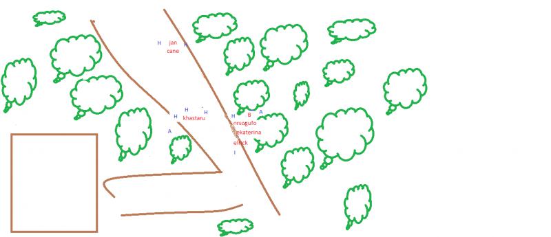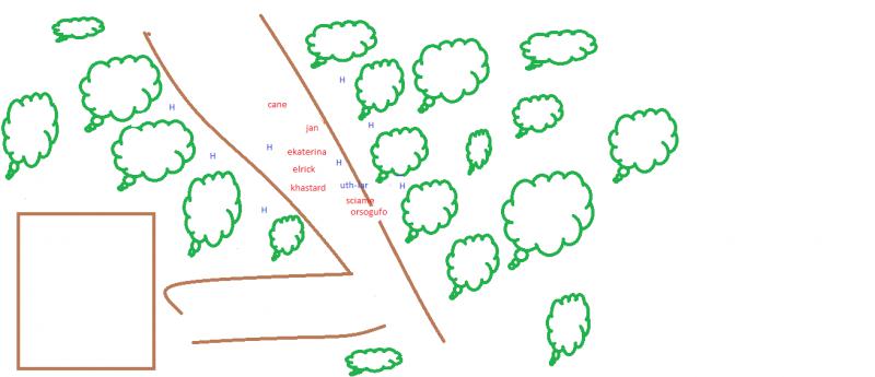 10 Gennaio 201510 anni Autore comment_1023904 Con un colpo da maestro, Khastard fa calare la sua lama sul capo del grosso cane, decapitandolo con una forza sovrumana. Uth-Lar riesce a fare un passo per liberarsi dal fastidio dello scame di pipistrelli e, seppur in modo goffo, tenta di usare le sue spade per disperderli, fallendo nel tentativo. L'incontro sembra volgere a favore del gruppo, ma un altro grosso cane dal pelo ramato compare dal nulla alle spalle, sputando fuoco; e dalla foresta sentite grida di battaglia, seguite dalla comparsa sulla scena di ulteriori hobgoblin. @tutti Spoiler: Elrick viene colpito da un freccia degli arcieri, e subisce 7 danni (già contata la RD). Il fuoco investe, invece, Jan ed Ekaterina che subiscono, rispettivamente, 3 e 7 danni. Questa la nuova situazione: Ho scritto i nomi, così dovrebbe essere più chiaro. Le H sono gli hobgoblin "normali". Segnala