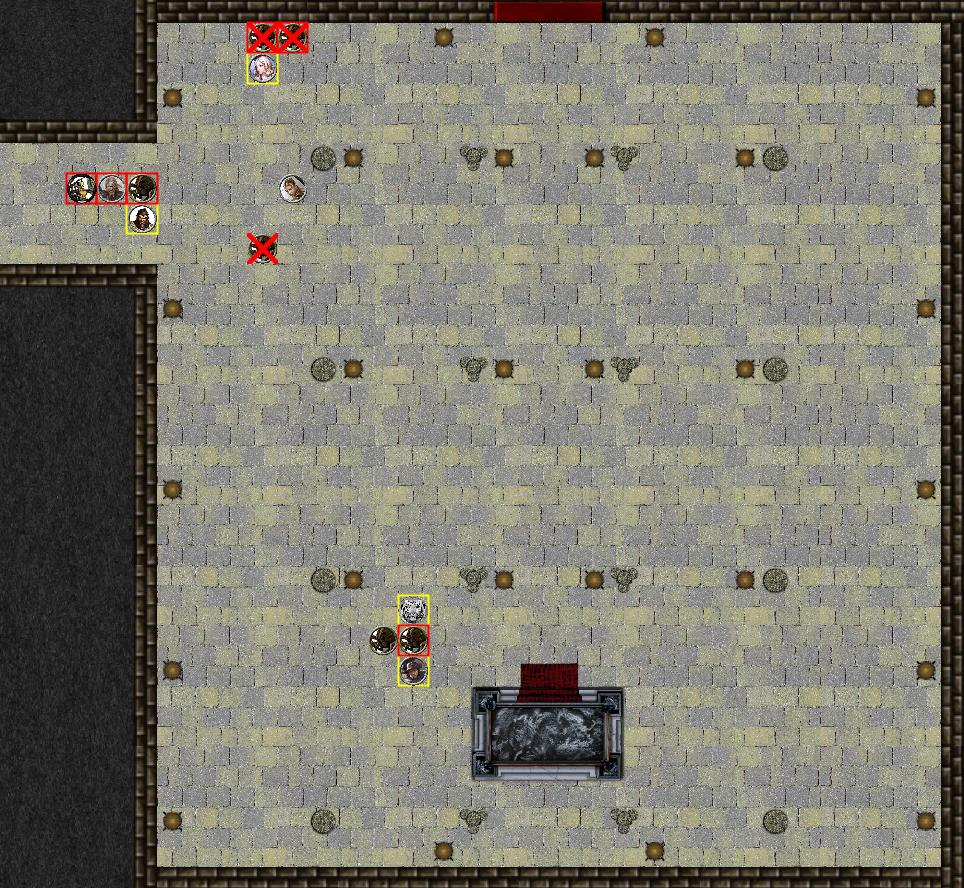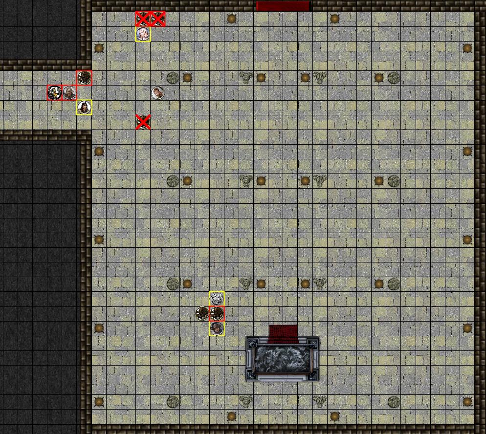 9 Giugno 20169 anni Autore comment_1211824 Elenys porta a segno un altro fendente contro il proprio avversario, aprendo un nuovo squarcio sulla pelle della creatura facendola crollare a terra senza vita. Barand nel frattempo si sposta quel tanto che basta per dargli agio ed invocare una preghiera. Il suo tocco su jan ha l'effetto desiderato e alcune ferite del guerriero si rimarginano immediatamente. Jan continua a menare fendenti contro l'enorme mostro aprendo nuove ferite ma non sembrano rallentare la creatura. Aredhel continua a scoccare contro il verme che minaccia Jan e Barand andando di nuovo a segno con entrambe ma la creatura, suppur sanguini copiosamente, non cede, mentre redireziona Tempesta a dare man forte ad Havllam. La tigre corre quindi in direzione dello spadaccino per ingaggiare i suoi avversari. Havllam Spoiler Il fastidio alla testa si sta trasformando in dolore. Nessuna penalità al momento. Iniziativa Spoiler ROUND 3 terminato ROUND 4 - Tocca ad Havllam Jan - Agito Aredhel + Tempesta - Agito Havllam - Deve Agire Mostro grosso - In attesa del proprio turno Vermoni - In attesa del proprio turno Elenys - In attesa del proprio turno Barand - In attesa del proprio turno Situazione Spoiler ROUND 3 Elenys attacca vermone a nord, colpisce infligge 9 danni, vermone muore Barand si sposta e cura Jan, cura 13 pf ROUND 4 Jan attacca mostro grosso, colpisce ed infligge 21 danni Aredhel scaglia 2 frecce (usate 8 totale) contro vermone in mischia con Jan e Barand, una manca, colpisce con entrambe e infligge 13 danni Tempesta si muove in corpo a corpo con i vermoni in mischia con Havllam. Non riesce ad attaccare questo round. Situazione: Pf Subiti / Massimi Jan 26 / 43 Elenys 4 / 31 Tempesta 5 / 34 Barand 6 /41 Havllam 11 / 31 Mappa is back! Spoiler Ho modificato i marcatori di colore, magari si capisce meglio. X rosse = Morti Rettangolo rosso = Visibilmente ferito. Rettangolo giallo = Ferito in maniera apparentemente lieve. Naturalmente per i mostri si basa solo su quello che vedete e non il loro reale stato di salute. Modificato 9 Giugno 20169 anni da Alabaster Segnala