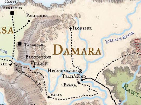 Conosci benissimo lo stemma presente sulle vesti e sui vessilli dei nuovi arrivati. Una pietra rossa contornata da fiocchi di neve è lo stemma della famiglia Dragonsbane, nientemeno che la famiglia reale di Heliogabalus, capitale del regno di Damara, nel quale vi trovate. Lo stemma è composto dai due elementi che più contraddistinguono il regno: la neve (Damara è infatti uno dei regni delle Terre Fredde) e la Pietra di Sangue, una preziosa gemma estratta in quantità sulle montagne e nelle miniere del regno. A giudicare dall'abbigliamento (noti solo ora che porta a tracolla una borsa ricolma di documenti) l'uomo elegante è un messo della famiglia reggente, scortato da una piccola guarnigione di guardie cittadine. Sai che fino a qualche anno fa le guardie della capitale erano per lo più dei mercenari mentre ora, re Gareth Dragonsbane ha incaricato i vecchi paladini del regno di addestrare la nuova guardia cittadina. Sai inoltre che il re cerca in tutti i modi di attirare avventurieri a Damara, offrendo numerose opportunità di "lavoro".