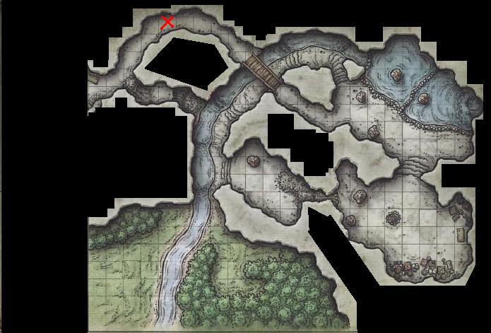 27 Ottobre 20159 anni Autore comment_1130558 Vi riorganizzate velocemente e decidete di andare alla ricerca di Gundren...o di quello che ne rimane. Non vi resta che esplorare la parte orientale della grotta; vi dirigete dunque verso il ponticello: qui si trova ancora il cadavere del goblin che avete ucciso. Aradia e Durkan come al solito vanno in avanscoperta e, non notando minacce, vi fanno segno di proseguire. Vi ritrovate in un corridoio buio che prosegue per qualche metro per poi svoltare a sinistra. Aradia si sporge dalla curva e vede che il corridoio termina più avanti in una grotta illuminata. Sulla sinistra, un passaggio scende verso il basso. Promemoria danniAlbus 3/9Aradia 0/10Durkag 10/15Samuel 6/13 x rossa: voi siete qui Fatemi sapere chi tiene l'ultima pozione. Modificato 27 Ottobre 20159 anni da Hicks Segnala