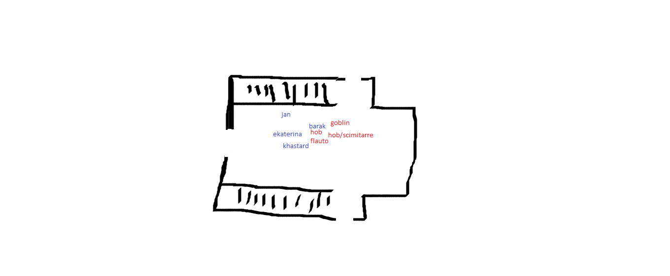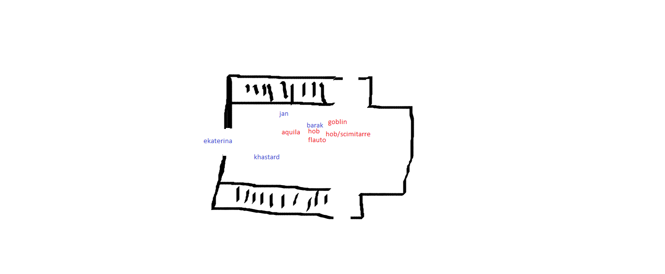 17 Marzo 20169 anni comment_1182436 Barak continua nella sua presa sul goblin, stringendo ancor di più la morsa, mollandogli anche un paio di pugni ben assestati. Dal canto suo, il piccolo essere non può far altro che dimenarsi per cercare di liberarsi, ma le mani d'acciaio del chierico sono ben strette attorno al suo corpo. La mischia ormai è totale: mentre l'hobgoblin con due scimitarre sembra arretrare di fronte al gesto teatrale di Ekaterina, l'altro continua a voler aiutare il piccolo goblin, colpendo Barak col suo pugnale. Anche in questo caso, però, il chierico della Madre Orsa viene solo sfiorato dalla lama, forse perché l'avversario è terrorizzato di poter colpire anche il suo amico. @Iniziativa Spoiler Tocca a tutti voi @Barak Spoiler 1 danno Segnala