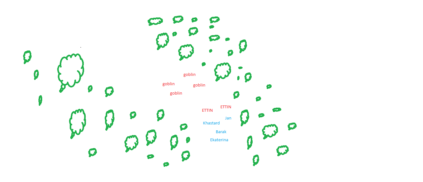 9 Maggio 20169 anni comment_1201152 Jan scocca le prime frecce proprio mentre venite notati dal gruppo avversario, ma riesce ad abbattere uno dei goblin prima che questi possa rispondere. Anche Khastard è molto rapido nello scagliare due frecce, ma queste finiscono molto lontane dal bersaglio. I due giganti con la doppia testa, anche se lenti di comprendonio, si fiondano su di voi, coprendo la distanza che vi separa ad ampie falcate. I goblin, invece, più cautamente si avvicinano, imbracciando gli archi e scoccando frecce nel mucchio. Barak Spoiler 3 danni, colpito da una freccia Iniziativa Spoiler Jan 21 Khastard 20 Ettin (due)18 Goblin (quattro su cinque iniziali) 16 Ekaterina 12 ----> tocca a voi Barak 7 Gli Ettin sono arrivati a portata, i goblin sono a 15 metri. Modificato 10 Maggio 20169 anni da Hennet87 Segnala
