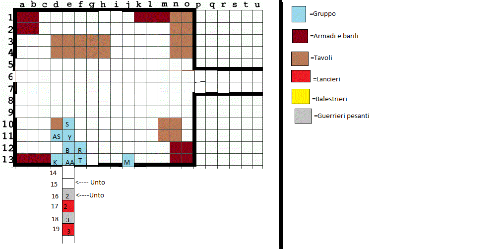 2 Gennaio 20169 anni Autore comment_1153863 Sarah e Yask scoccano nello stesso momento: la freccia di Yask colpisce l'uomo in mezzo alla fronte, e quella di Sarah dritta al cuore. Il balestriere scivola dalle spalle del compagno, cadendo a terra già cadavere. Bernardo si incammina, tranquillamente e miscelando un altra fiala, dietro ad Aaron. Sempre con la stessa calma consiglia al duellante "Spostati di lato, facciamoli entrare... ed ora abbassa la testa." e lancia la fiala azzurra addosso al balestriere al suolo con una parabola perfetta: la fiala si infrange sull'elmo dell'uomo, esplodendo in una nova gelata tale da avvizzirgli la carne e rendergliela bluastro-violacea... e vedete la testa e l'elmo bucati orrendamente da innumerevoli cristalli di ghiaccio rossi: il sangue congelato all'improvviso ha spappolando il cervello.. L'esplosione ha riempito di neve, ghiaccio e ustioni da freddo anche i due alabardieri, ed ha riempito mura e pavimento di chiazze di ghiaccio e di candida neve. Rose si scansa vedendo Tural rientrare nella sala grande, dopo che il paladino ha mozzato la testa all'alabardiere già provato dalla freccia di Sarah e dall'esplosione della bomba.INIZIATIVA:Rose (27/39 HP, WEAPON SONG: +1 KATANA, +1 CA, ISPIRARE CORAGGIO [+1], AZIONE PREPARATA)Aaron(23/37 HP, SUL TAVOLO, WEAPON SONG: +1 AD UN ARMA, ISPIRARE CORAGGIO [+1]) <----Tocca a teAstrid (27/33 HP, SUL TAVOLO, WEAPON SONG: +1 SCIMITARRA, +1 CA)Eretici con lo Scudo (N°1 MORTO, N°2 In GINOCCHIO [STORTA] E 18 DANNI)Eretici con Alabarda (N°1 MORTO, N°2 18 DANNI)Eretici con Balestra (N°1 MORTO, N°2 MORTO)Yask (34/35 HP, SUL TAVOLO, WEAPON SONG: +1 ARCO, +1 CA, ISPIRARE CORAGGIO [+1]) Bernardo (24/30 HP,SUL TAVOLO, WEAPON SONG: +1 ARCO, +1 CA, ISPIRARE CORAGGIO [+1], SCUDO (+4 CA)) Knud (33/39+6 HP, WEAPON SONG: IRA, +1 CA, ISPIRARE CORAGGIO [+1]) Tural (27/33 HP, WEAPON SONG: +1 FALCHION, +1 CA, ISPIRARE CORAGGIO [+1]) Sarah (24/30 HP, WEAPON SONG: +1 ARCO, +1 CA, ISPIRARE CORAGGIO [+1]) Dadi Spoiler Yask scocca su Balestriere 2: 10+10=27 preso, 8+7=15 danni Bernardo lancia una bomba gelida su Eretico Balestriere 1: 20! conferma 18+9 confermata, 6+4+7x2= 34 danni... esploso. Eretico con Scudo 2 ed Eretico con Alabarda 1 e 2 prendono 18 danni da spargimento (dopotutto è il danno minimo... di una bomba crittata!!!) Knud si muove Tural attacco su Eretico con Alabarda 1: 8+10=18 preso, 4+4+12=20 danni, morto Sarah scocca su Balestriere 2: 14+9=23 preso, 7+5=12 danni, Balestriere 2 muore Rose prepara un azione Modificato 2 Gennaio 20169 anni da Tarkus Segnala