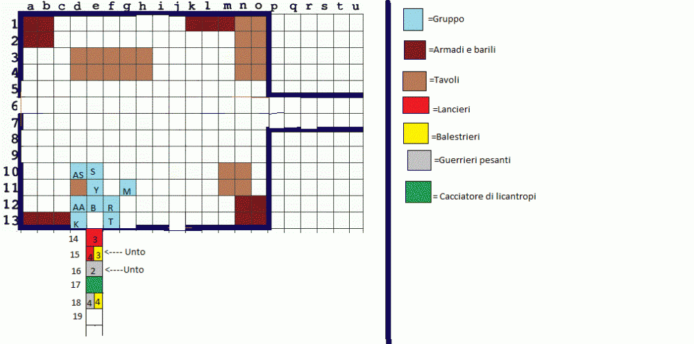 4 Gennaio 20169 anni Autore comment_1154377 Sfortunatamente i corpi martoriati, mutilati, bruciati e congelati delle vostre vittime sono molto più spaventosi di Knud che digrigna i denti... e gli uomini ancora in piedi, vedendo il cacciatore agguerrito, non si danno per vinti. Anche se, effettivamente, dovrebbero... le frecce di Yask e Sarah colpiscono gravemente il balestriere, e Bernardo miscela un altra bomba e la lancia... sfortunatamente riesce a prendere il cacciatore non in testa ma alla gamba. Però l'esplosione colpisce anche il balestriere, congelandogli la schiena e facendolo cadere all'indietro, rompendosi il collo nella caduta. Rose rinfodera la katana e prende una balestra, caricata con un rampino: riesce, nonostante le numerose persone tra lei ed il cacciatore, a colpirlo al ginocchio ed a tirarlo, rapidamente, verso di voi... e Tural ne approfitta per tirare un colpo nel petto dell'uomo. Bernardo risponde a Molos "Mai sentito nominare. Finiamo con questa... feccia illetterata, e poi parleremo di cose importanti. Cosa ne dici, pallido amico?"INIZIATIVA:Rose (30/39 HP, WEAPON SONG: +1 KATANA, +1 CA, ISPIRARE CORAGGIO [+1], INFERNAL HEALING (7 ROUND))Aaron(23/37 HP, SUL TAVOLO, WEAPON SONG: SPADA BASTARDA +1, ISPIRARE CORAGGIO [+1]) <----Tocca a teMolos (WEAPON SONG: PUGNALE DA LANCIO +1, +1 CA, ISPIRARE CORAGGIO [+1], ARMATURA MAGICA) <----Tocca a teAstrid (25/33 HP, SUL TAVOLO, WEAPON SONG: +1 SCIMITARRA, +1 CA)Eretici con lo Scudo (N°1, 2 E 3 MORTI, N° 4 8 DANNI)Cacciatore di Lupini (38 DANNI, INTRALCIATO [-4 Dex, -2 TxC e movimento dimezzato] 5 ROUND E PRONO)Eretici con Alabarda (N°1, 2 E 3 MORTI, N°4 17 DANNI E PRONO)Eretici con Balestra (N°1 MORTO, N°2 MORTO, N°4 33 DANNI, N°3 13 DANNI E PRONO)Yask (34/35 HP, SUL TAVOLO, WEAPON SONG: +1 ARCO, +1 CA, ISPIRARE CORAGGIO [+1]) Bernardo (24/30 HP,SUL TAVOLO, WEAPON SONG: ARCO +1, +1 CA, ISPIRARE CORAGGIO [+1], SCUDO (+4 CA)) Knud (33/39+6 HP, WEAPON SONG: IRA, +1 CA, ISPIRARE CORAGGIO [+1]) Tural (29/33 HP, WEAPON SONG: FALCHION +1, +1 CA, ISPIRARE CORAGGIO [+1]) Sarah (24/30 HP, WEAPON SONG: ARCO +1, +1 CA, ISPIRARE CORAGGIO [+1]) Dadi Spoiler Yask scocca su Balestriere 4: 8+10=18 preso, 3+7=10 danni Knud Intimidire: 2+11=13 NOPE Bernardo lancia una bomba su Cacciatore di Lupini: 17+6=23 preso, 4+3+6=13 danni e TS di Tempra: 14+5VS16 superato, non è Barcollante Danno da spargimento: 8. Balestriere 4 muore Sarah scocca su Balestriere 4: 12+9=21 preso, 5+5=10 danni Rose recupera 1 hp Rose impugna la balestra spara-rampino e scocca su Cacciatore di Lupini: 19+6=25 preso, 5 danni+Trascinare gratuito: 20+9=29 riuscita... Azione preparata di Tural: 17+8=25 preso, 4+4+11=19 danni Modificato 4 Gennaio 20169 anni da Tarkus Segnala