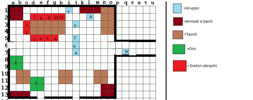 23 Dicembre 20159 anni Autore comment_1151444 Yask, vedendo Sarah in difficoltà, attacca l'uomo di fronte a lui: la lama bimetallica penetra in profondità, tagliando l'uomo dalla spalla al bacino... per poi cadere a terra, in rumore di ferraglia ed il tonfo del martello. Rose lancia la bottiglia incendiaria sull'uomo con la freccia nel braccio, dandogli fuoco ai capelli, per poi saltare sul tavolo ed essere pronta ad attaccare l'altro che sta attaccato alla barda. Gli altri eretici si muovono: uno prova a martellare Yask e vendicare l'amico, ma il colpo è lento e goffo. Aaron è ancora più fortunato; sfila dalle mani il martello che voleva dargli sulla testa dandolo sulle braccia dell'altro, vanificando l'altro colpo in arrivo... e ricalcando la dose sul'uomo con cui scritto "ERETICO" sul braccio, aprendogli uno squarcio gemello sull'altro braccio. Gli ultimi due cercando di distruggere gli orsi che, nonostante siano aperti in più punto, sfondati e che perdono paglia da tutte le parti, sono ancora in piedi.INIZIATIVAAaron [20+] (ISPIRARE CORAGGIO: +1 TxC, +1 DANNI, +1VS CHARME E PAURA) Molos [20] (ISPIRARE CORAGGIO: +1 TxC, +1 DANNI, +1VS CHARME E PAURA, COPERTURA (ORSO) +2 CA) Orsi [Con Molos]] (ORSO 1 6/63 HP, ORSO 2 4/63 HP) Eretici 6-10 [20-] (BRILLI, N°6 17 DANNI, N°9 32 DANNI, IRA)Yask [17] (ISPIRARE CORAGGIO: +1 TxC, +1 DANNI, +1VS CHARME E PAURA) Rose [15] (ISPIRARE CORAGGIO: +1 TxC, +1 DANNI, +1VS CHARME E PAURA, 7 DANNI)Eretici 1-5 [13] (BRILLI, N°3 29 DANNI E DISARMATO, N° 2 10 DANNI)Knud [13-] (3/39 HP,ISPIRARE CORAGGIO: +1 TxC, +1 DANNI, +1VS CHARME E PAURA) <---- Tocca a teTural[10] (ISPIRARE CORAGGIO: +1 TxC, +1 DANNI, +1VS CHARME E PAURA) <---- Tocca a teSarah [7] (17/30 HP, ISPIRARE CORAGGIO: +1 TxC, +1 DANNI, +1VS CHARME E PAURA)Eretico 11 [3] (BRILLO,20 DANNI, A FUOCO) Dadi Spoiler Yask attacca Eretico 10: 18! conferma 17+13=30 confermato, 10+14x2=48 danni, shottato Rose lancia la molotov su Eretico 11 e si sposta in H3: 10+9 colpito, 6+2(studiato)+3 (furtivo)= 11 danni, TS per non prendere fuoco: 4+3=7 nope Acrobazia di Rose: successo automatico Eretico 1 attacca Yask: 5+10=15 nope Eretico 2 attacca Orso 2: 11+10=21 preso, 2+2+7=11 Eretico 3 attacca Aaron, parry di Aaron: 1!VS2+9=11, Eretico 3 disarmato, AdO di Aaron: 16+9=25, 8+7=15 danni Eretico 4 attacca Aaron: 7+10=17 nope Eretico 5 attacca Orso 1: 13+10=23 preso 1+3+7=11 danni Modificato 23 Dicembre 20159 anni da Tarkus Segnala