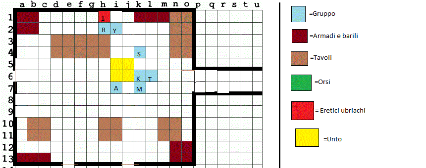 28 Dicembre 20159 anni Autore comment_1152323 Le offese di Aaron non vengono calcolate minimamente dagli eretici, mentre le sue spadate fanno danno: l'uomo armato di sedia cade sotto l'ennesimo colpo, mentre con il secondo colpisce l'eretico chinato in pieno petto; appena estrae la lama, ormai talmente piena di sangue che il caldo liquido ne cola in un rigagnolo costante, la ferita dell'uomo viene cauterizzata da un doloroso Marchio, Marchio che dice "ERETICO" Molos dice "Puff e sparisco!" per poi, effettivamente, sparire. Vedete subito dopo una familiare scintilla vicino all'eretica: Molos che estrae la lama celata. Ma la donna è talmente confusa dalla sparizione da non farci caso. La compagna e l'amico al suo fianco, però, si fiondano senza indugio su Knud e Tural: l'uomo colpisce Knud al braccio, mentre la donna colpisce Tural con la parte laterale dal martello sullo stomaco, mozzandogli il respiro.INIZIATIVAAaron (ISPIRARE CORAGGIO: +1 TxC, +1 DANNI, +1VS CHARME E PAURA) Molos (ISPIRARE CORAGGIO: +1 TxC, +1 DANNI, +1VS CHARME E PAURA) Eretici 6-10 (BRILLI, N°6 37 DANNI, N°7 7 DANNI, N° 10, 8 E 9 MORTI, IRA)Yask (22/35 HP, ISPIRARE CORAGGIO: +1 TxC, +1 DANNI, +1VS CHARME E PAURA) <---- Tocca a teRose (32/39 HP, ISPIRARE CORAGGIO: +1 TxC, +1 DANNI, +1VS CHARME E PAURA)Eretici 1-5 [(BRILLI, N°3 MORTO, N°5 24 DANNI, N° 4 MORTO, N°2 38 DANNI E IN GINOCCHIO IRA)Knud (15/39+6 HP,ISPIRARE CORAGGIO: +1 TxC, +1 DANNI, +1VS CHARME E PAURA, BLOODRAGE: +4 FOR E COS, +2WILL, -2CA)Tural (18/33 HP, ISPIRARE CORAGGIO: +1 TxC, +1 DANNI, +1VS CHARME E PAURA,) Sarah (17/30 HP, ISPIRARE CORAGGIO: +1 TxC, +1 DANNI, +1VS CHARME E PAURA) Dadi Spoiler Aaron Spellstrike+Incantare in combattimento (Concentrazione: 13+13 superata): 14+8 preso, lo shotti perché aveva pochi pf, passo di 1,5m e attacco con Marchio su Eretico 2: 20! conferma 17+8 confermato, 6+7+1x2= 28 danni e marchio figo. Molos usa la bacchetta di Vanish (usare bacchette non provoca AdO) Eretico 6 attacca Knud: 17+10=27 preso, 4+3+7=14 danni Eretico 7 attacca Tural: 15+10=15 preso, 4+4+7=15 danni Modificato 28 Dicembre 20159 anni da Tarkus Segnala