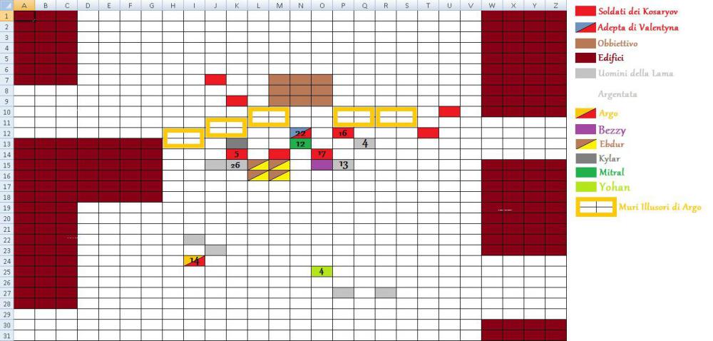 5 Febbraio 20169 anni comment_1167769 Argo Velliatar Uno dei dardi dei balestrieri arriva a colpirmi al fianco. Argh! Maledizione! Impreco mentre mi tengo con una mano la ferita, con la freccia ancora conficcata. Balestrieri eh? Vi sistemo io. Pronuncio una formula magica, e dei muri di pietra sorgono dal terreno, bloccando la vista dei balestrieri nemici. Questo dovrebbe tenerli impegnati per un po' penso mentre mi sposto verso l'edificio a sinistra. @DM Spoiler Lancio immagine silenziosa per creare dei muri di pietra illusori, alti 3 metri. Ti allego una mappa per farti vedere come li dispongo: il mio obiettivo è fargli perdere almeno un round tra ricarica e spostamento. L'incantesimo permette un Tiro Salvezza su Volontà dubita (CD 15) nel caso interagiscano con l'illusione (devono spendere un'azione per farlo). Infine mi sposto in I24. Segnala