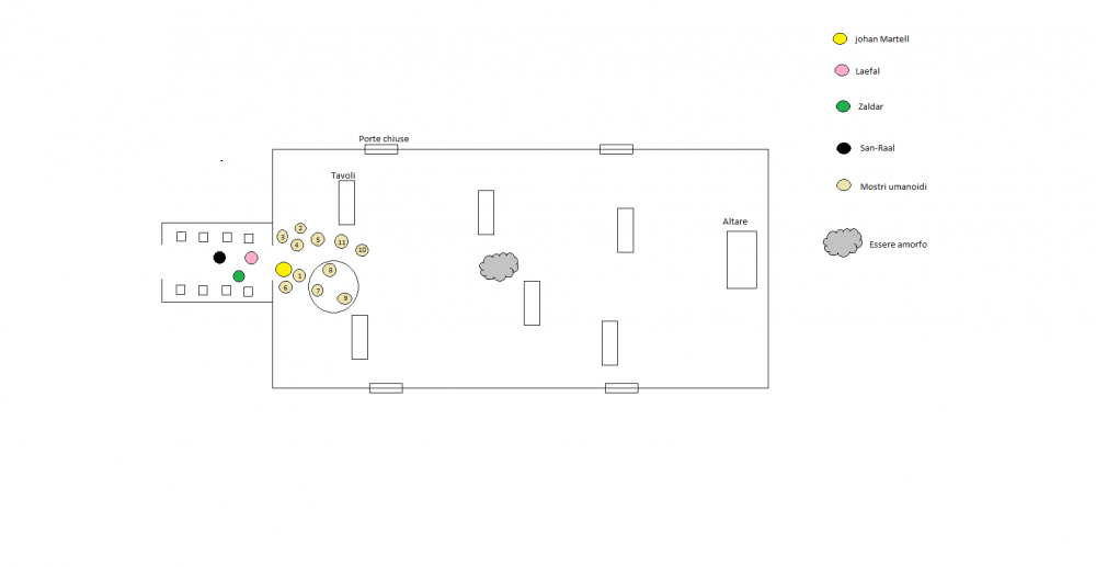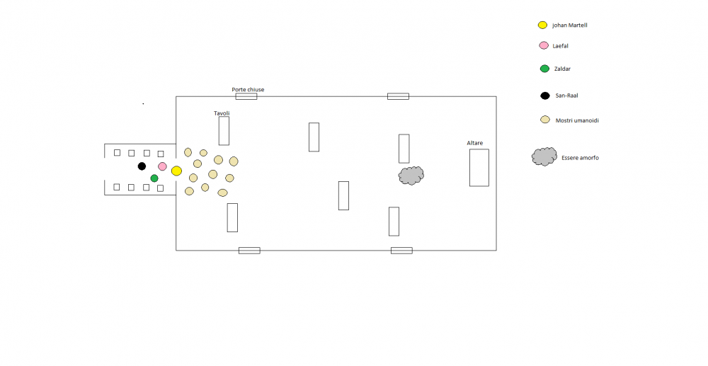 23 Giugno 20169 anni Autore comment_1217406 @Laefal Spoiler Sfortunatamente le dimensioni della porta , appena sufficienti a far passare una sola persona per volta e il fatto che Johan Martell occuopi la maggiorparte della linea di vista ti impediscono in questo momento di tirare. Al seguito di arcane parole Laefal cambia aspetto fino a diventare per tutto simile ad un elfo di superficie con pelle abbronzata , occhi color ambra e capelli color arancio-marrone , poi sentite un forte rumore provenire dalla sala e vedete che la massa informe ha schiantato uno dei rozzi tavoli nella sua avanzata verso di voi , intanto le creature umanoidi facendo versi animaleschi corrono verso di voi arrivando ad ammassarsi tutte intorno alla porta aperta senza però riuscire ad attaccare... @ iniziativa Spoiler Johan Martell Laefal ZaldarSan-Raal Modificato 23 Giugno 20169 anni da Dardan Segnala