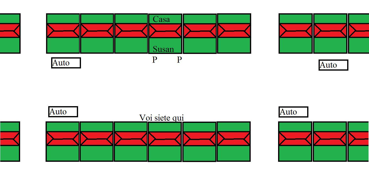 22 Settembre 20169 anni comment_1252185 18 ore fa, Fiore di Loto ha scritto: Scusa Master, ma di quanta polizia stiamo parlando? Sulla porta di casa di Susan sono rimasti due poliziotti che, dopo aver steso il nastro nero e giallo, controllano la strada. 18 ore fa, Fiore di Loto ha scritto: E quanti "non poliziotti" (giornalisti, curiosi, vecchietti che guardano il cantiere) ci sono? Oltre alla vecchietta inizia ad esserci un pò di movimento. Tieni presente che sono le 08:30 passate, la gente inizia ad uscire di casa per andare al lavoro. 18 ore fa, Fiore di Loto ha scritto: Inoltre, a naso, quanta strada dovrei fare per trovare un veicolo da sgraffignare? I primi veicoli che hai adocchiato si trovano in un raggio di una cinquantina di metri da te Questo a graaaaaaaaaaaaandiiiiiiiiiiiiiiiiiiiiiiiiiiiiiiiiiii linee è uno schema del quartiere Quelle in rosso sono le case con il giardino (verde) davanti e dietro. Le P indicano i due poliziotti. Segnala