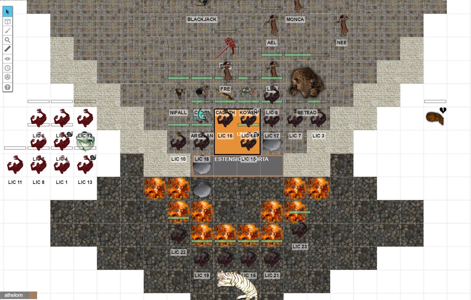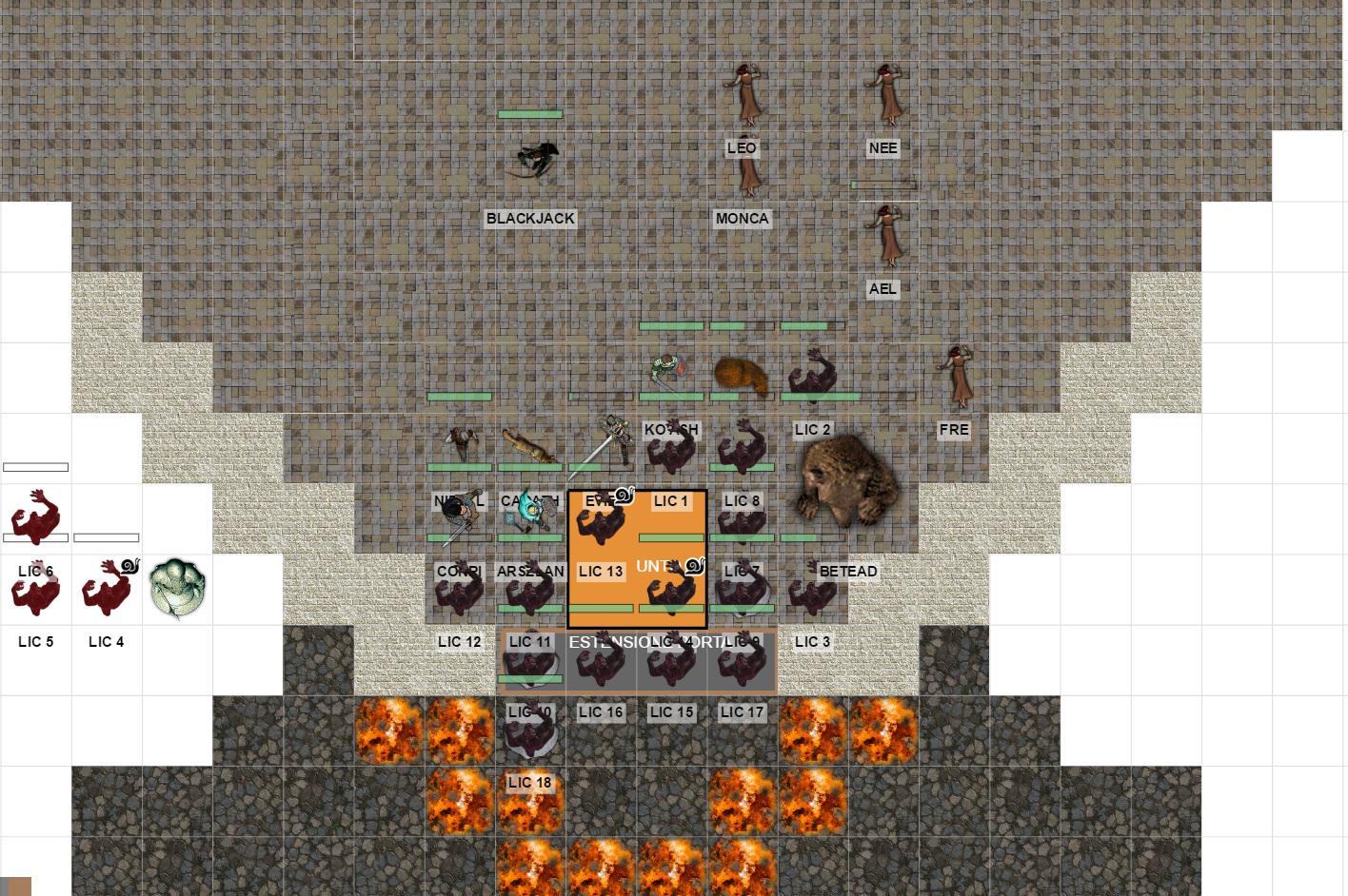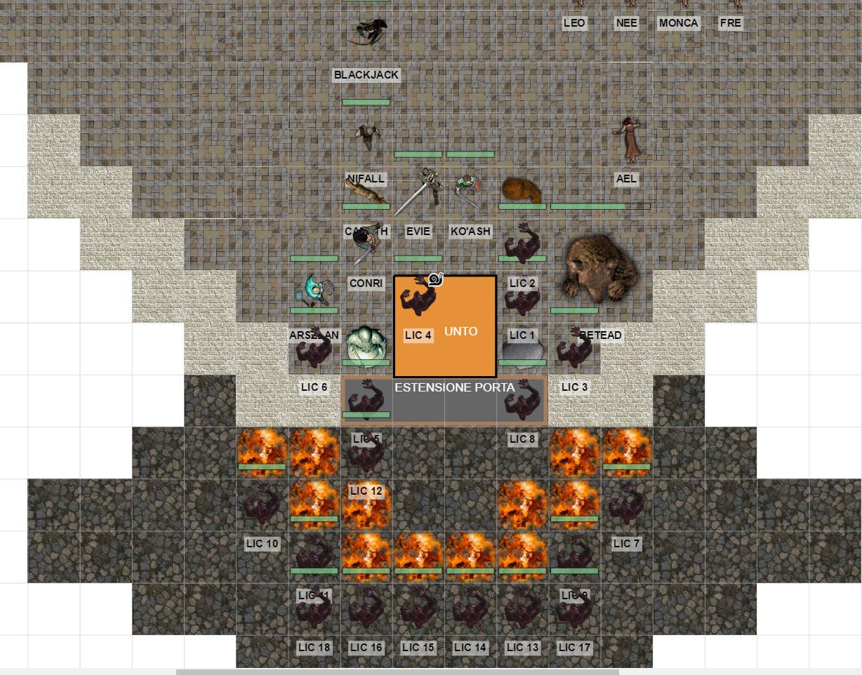 22 Agosto 20169 anni Autore comment_1239616 Spoiler CONRI: L'alabarda NON HA reach, tu hai una giusarma XD Ragazzi, sono a londra e ho 10 minuti: perdonatemi se a questo giro non metto tutti i dadi ed i dati ma non ho tempo. Metto solo l'essenziale. Leggete sotto e capite quanto è infernale da gestire via cellulare questa battaglia XD SONO PIU' DI TRENTA TIRI! UN FOTTUTO ROUND!! contateli e fatemi una statua per ogni decina, danni compresi. CONRI VS LIC4 = Becca: 11 danni Conri(spirito) vs LIC4 = Manca CADATH vs LIC4 = Manca NIFALL(Freccia di prima) = Manca NIFALL CONCEDE BONUS 3CA (Conri; Arszlan) 1+dex attacchi EVIE vs LIC4 = Manca EVIE(spirito) vs LIC4= Becca: 6 danni (LIC 4 MORTO) BLACKJACK: Evil eye su LIC1 (RIUSCITO, -2 AC PER 7 ROUND) AEL Tira su LIC 2= Becca: 5 danni EDIT: QUESTI DANNI HO DIMENTICATO DI SEGNARLI IN IMMAGINE. ARSZLAN Spinge la statua= Riesce Danni da caduta sui LIC5, LIC12: 9 BETEAD VS LIC3: COLPITO, danni 9 BETEAD(spirito) VS LIC 2: COLPITO, danni 4 ORSO VS LIC1: COLPITO, danni 3(ridotti) ORSO(SPIRITO) VS LIC1: MANCATO _____Licantropi_____ AdO Aszlan vs LIC 5: COLPITO, danni 15 AdO Conri vs LIC 5: COLPITO, danni 12 LIC 5 MORTO AdO Betead vs LIC 8: COLPITO, Danni 11 AdO Evie vs LIC 13: COLPITO, Danni 9 LIC2 vs AEL: COLPITO, danni 12 LIC3 vs Betead: MANCATO LIC8 vs Orso: COLPITO, danni 10 LIC1 vs EVIE: COLPITO, danni 17 LIC7 vs Betead: COLPITO, danni 8 LIC11 VS Arszlan: MANCATO Tutti gli altri o muovono, o hanno fatto azioni standard per scalare i detriti e muovere. _____vostro turno nuovo____ ATTTENZIONE--PERICOLO MASTER stolto--- NON HO RIMOSSO LIC2 A SEGUTO DEI PROSSIMI EVENTI--- NON CONSIDERATELO--- Alcuni png agiscono prima di voi. AEL: passo 1.5 e attacco. AEL vs LIC 2: CRITICO: danni 29 FRE vs Betead: Cura ferite leggero: +7pf Velocemente, dopo la prima timida avanguardia, lo scontro si lancia nel suo vivo. Evie e Conri, insieme a Cadath e gli spiriti fanno gruppo abbattendo velocemente il mannaro in caduto vittima dell'unto. Arszlan nota come i licantropi riescano a passare tra la statua e la porta e quindi col sui martello senza troppe cerimonie percuote la statua facendola cadere verso il nemico: ne investe due in pieno che non riescono a scansarsi i quali vengono feriti dal pesante impatto, forse sarebbero pure morti se non fosse per la loro pellaccia da licantropo. Betead, dal canto suo, concentra i suoi sfori per sfoltire i nemici avanti a se', orso lo aiuta e la nativa di nome AEL non è da meno: nessuno dei licantropi perisce, ma almeno molti di loro portano gravi ferite. I licantropi sul posto si fiondano nella mischia, e le tetrovie velocemente si uniscono alla battaglia. Un paio di loro tentano di passare i detriti a sinista, ottenendo solo che uno di essi decori il pavimento grazie agli sforzi congiunti di due che si stanno rivelando fratelli d'arme ben coordinati come Conri ed Arszlan. In simil modo, Betead procura una ferita grave ad uno dei licantropi che saltavano i detriti. Uno dei licantropi avanza solo per volare al suolo. Tenta di alzarsi, ma Evie non glielo permette ferendolo gravemente. Uno dei licantropi, con un passo lungo e molto scaltro raggiunge le spalle di Betead, puntanto l'arciera Ael. Le tira un colpo d'ascia, e per quanto questa finga di stare bene, accusa gravemente il colpo e la chiazza di sangue al suolo dalla ferita al braccio evidenza la gravità. Un altro paio di colpi vengono sferrati verso la maga, attirandosi parecchio odio dai licantropi visto che indossa ancora la pelle di un loro compagno e ne ha uccidi parecchi da sola: un colpo d'ascia penetra l'armatura pettorale strappandole un urlo di dolore ed un fiotto di sangue mentre inizia a sfocarsi la sua vista. Il piccolo orso viene ferito, ma anche il grande orso Betead viene bersagliato su piu' fronti, riportando una ferita relativamente lieve ma sommate alle altre iniziavano a debilitarlo parecchio. Un ultimo colpo vola verso Arszlan, mancandolo grazie all'aiuto dalle retrovie. Prima che gli eroi possano reagire, alcuni dei loro gretagri si muovono: AEL arretra sparando una freccia dritta negli occhi si un licantropo, barcollando debole. Un altra delle locali, Fre, accorre alle spalle di Betead e mormorando qualche parola ed imponendo le mani alcune, poche, ferite si richiudono. Alcuni dei lupi in pos Segnala
