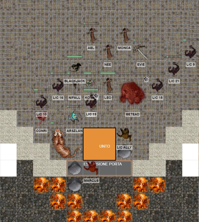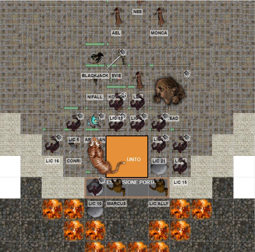 7 Settembre 20169 anni Autore comment_1245359 Spoiler KO'ASH vs LIC 20: Colpito. Danni 7 BETEAD vs LIC 20: Colpito. Danni 6 ---LIC 20 a TERRA--- BLACKJACK vs TIGRE: Colpito. Danni 8 NIFALL: FUOCO DELL'ALCHIMISTA. - LIC 6 COLPITO, Danni 6 - LIC 7, 19, 21, 3 e BETEAD colpiti per 1 DANNO --- LIC 6, 3 MORTI --- CONRI vs TIGRE: Mancato AEL vs TIGRE: Colpito. Danni 10 NEE vs LIC 19: Trip con Tanglevine (Sp) RIUSCITO (LIC 19 a terra) LEO vs LIC 19: Colpito. Danni: 1 (ridotto) EVIE ritarda dopo ALLY _____LICANTROPI_______ TIGRE vs Marcus: CRITICO, danni 39 --- Marcus svenuto, morente (-8) --- TIGRE vs CONRI: Colpito. Danni 15 --- CONRI SVENUTO (-6) BETEAD (AdO) vs lic 7: Mancato. ARSZLAN (AdO) VS LIC 16: Colpito. Danni 9 ----LIC 16 MORTO--- LIC 7 vs BETEAD: Colpito. Danni 7 --- BETEAD SVENUTO (-5) ---- LIC 5 VS Nifall: COLPITO. Danni 18 (ahia) LIC 19 vs Ko'ash: mancato. Tutti gli altri alzano e muovono _____ALLY_____ LIC ALLY vs LIC 7: Colpito, danni 7 --- LIC 7 MORTO __________vostro (fine turno azioni ritardate + inizio turno vostro.___ Evie Alza e muove MONCA vs LIC 9: Colpito. Danni: 1 A voi ERRORE MIO: NELL'IMMAGINE LIC 16 E 5 SONO INVERTITI! LIC 5 E' LIC 16 I compagni si rialzano insieme ai nemici.... ed il caos degenera. Una boccetta piena di fuoco viene lanciata mentre Ko'ash e Betead assieme colpiscono un nemico uccidendolo. Quando atterra le fiamme investono vari nemici uccidendone alcuni di essi, ben due arsi vivi. Dalle spalle Nee la stregona evoca una liana dalla sua mano lanciandola alla caviglia di un licantropo, gettandolo al suolo. Conri prova ancora ad alzare la sua arma conto il grosso capo ora piu' guardingo di prima. Arszlan si alza in piedi con la guardia alta e una pioggia di colpi piove sul leonino, che riesce a deflettere solo grazie alla protezione aggiunta data dalla guardia alzata. Due colpi violenti piovono sulla tigre e sembra allo stremo mentre urla infuriata. Si sposta di lato... lanciando un grave fendente a marcus a sorpresa, ribaltandolo per l'impatto. Da te non me lo aspettavo! urla mentre marcus giace a terra in un lago di sangue. Non c'è tempo per preoccuparsi che un altro colpo vola dal licantropo verso la direzione diamentalmente opposta: Conri. Un altro colpo stende il guerriero mandando al suolo pure lui. I licantropi provano tutti ad alzarsi e combattere: alcuni muoiono nel tentativo, altri no. Uno riesce a colpire nuovamente betead, stendendolo senza perdere tempo. gli altri dallo stesso lato ne approfittano facendo il giro del druido per accerchiare il gruppo: feriti ma pronti a combattere. Anche dall'altra parte non si danno per vinti: un licantropo viene punto da Arszlan per il tentativo di passargli a fianco, mentre pero' un altro gia' vicino si muove scattando verso Nifall, il piu' vicino e fracile appena oltre Arszlan, certa vittima del grande tigre ormai. Un grave colpo ferisce il catfolk, dipingendo le sue vesti del suo stesso sangue. Dall'altra parte, l'ultimo dei traditori salta in combattimento comunque nonostante tutto urlando ed uccidendone uno. Evie, con l'ausilio della spada, si alza muovendosi dietro le tre ex schiave, mettendosi tra loro ed i tre licantropi che stanno facendo il giro, brandendo minacciosa la lama. Segnala