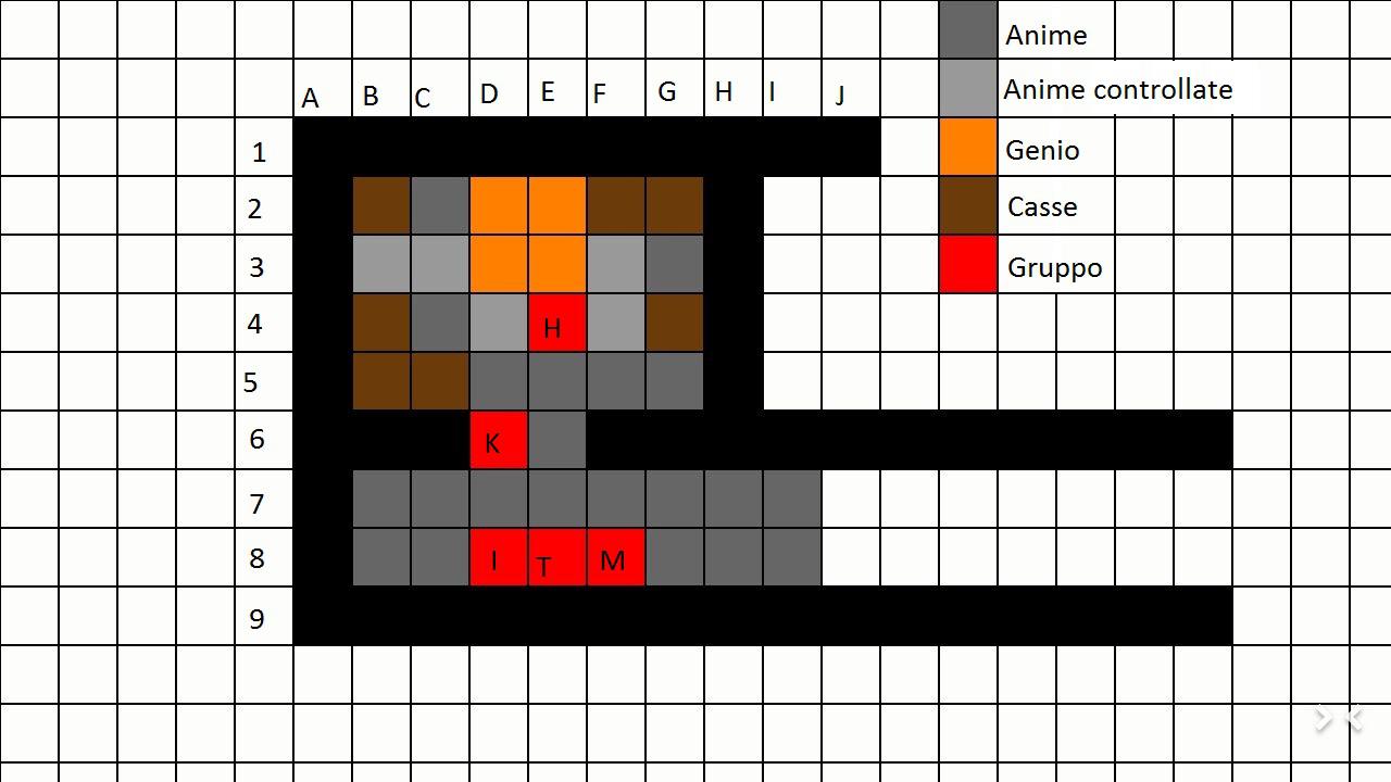 23 Novembre 20168 anni Autore comment_1278081 Maatani riesce a divincolarsi assistito da Ioka che sparando alla porta ne rompe alcune parti. Kanola si risveglia dal suo lentro trance e colpisce con forza la porta, la rabbia è ben visibile. Non si fa. Porta stai a cuccia. La porta viene aperta in due. Rivelando dietro di sé il genio di prima anche se leggermente deformato in volto e con nuove e raccapriccianti cicatrici per tutto il corpo. Prima di retrocedere tira l'ennesimo fendente colpendo per una seconda volta Maatani alla spalla. Su mortali venite, ho fame. Spoiler iniziativa: Ioka 23 Tabitha 22 Maatani 20 Genio 17 Hakuhai 15 Porta 12 Dadi: Spoiler Maatani artista delle fuga 26 riesce Ioka 23-21 colpito danni 15-24 (riduzione) Kanola 33! 32! Danni 34 no riduzione. Genio 25 danni 9 Mappa analogica Spoiler Oltre alla porta dove ora è Maatani avete una stanza 9×6 (6 di profondita) a 4.5 m sul soffitto un grande grande tubo. Il tutto é alto 3 metri. Ci sono casse in legno a destra e sinistra. Tre casse sono aperte e vedete paglia e vetri rotti al loro interno Modificato 23 Novembre 20168 anni da Xolum Segnala