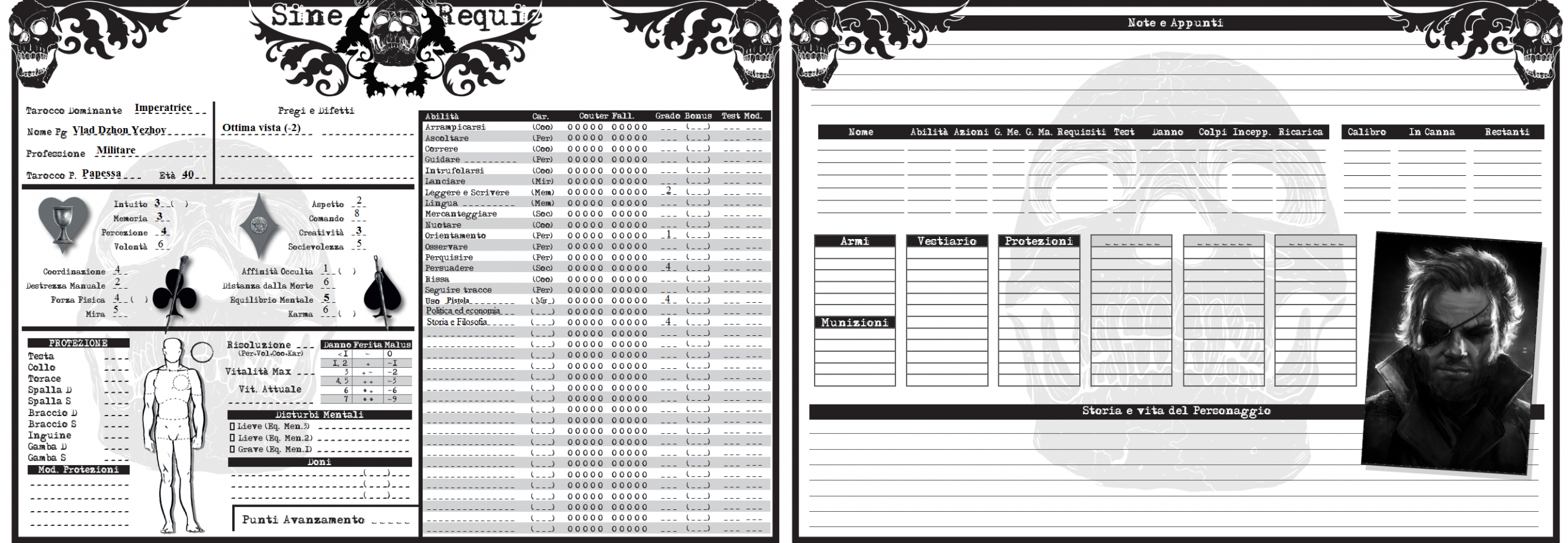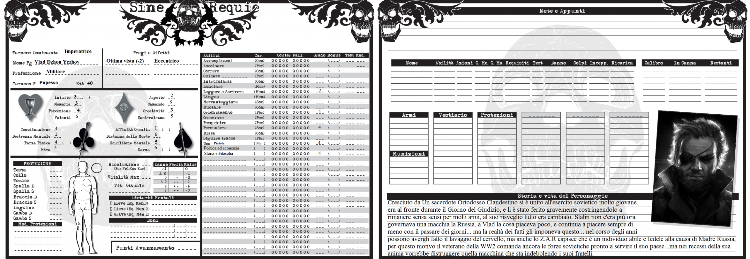 Pubblicato 16 Novembre 20168 anni comment_1275168 ho deciso di aprire un torpic di servizio per la assegnazione delle statistiche dei pg in modo da coordinarci meglio: ecco le mie pescate... almeno un pregio e i relativi difetti ho deciso che lo avrete tutti per rendere più veri i pg. accanto ad ogni carta scrivo il suo significato o il suo valore numerico da spartire agli attributi di quel particolare seme, nessuna caratteristica può mai essere inferiore a 2, nemmeno dopo aver applicato i malus derivanti da altre fonti. @Gordan Spoiler classe: 7 (ottieni le abilità: armi da fuoco, orientamento, intrufolarsi, perquisire, tattica, interrogare, impartire ordini, uso arma 2 a scelta) ricordati che essendo un classe 7 sei di base più anziano dei tuoi colleghi il che ti da delle abilità in più rispetto a loro (tattica, interrogare e impartire ordini) ,dei punti in più di loro da spendere per potenziare le tue abilità (cosa di cui mi ero dimenticata di accennare nel post precedente... correggerò poi.... ma queste cose costano, ottieni un malus di -1 a tutti gli attributi seguenti: aspetto, memoria, tutte le caratteristiche fisiche (fiori). tarocco dominante: l'innamorato (carattere:passionale, utopista, fanatico. bonus: +2 percezione, +1 aspetto, -1 volontà) o l'imperatrice (carattere: ama comandare ma con toni amichevoli. bonus: +2 volontà, +1 comandare, -1 affinità occulta) tarocco del passato: la papessa (passato: hai studiato e sei entrato in contatto con l'elite culturale. abilità bonus: politica ed economia, storia e filosofia) o la giustizia (passato: formazione in ambito di giustizia teorica o pratica. abilità bonus: legge, perquisire) se scegliquest'ultimavisto che hai già l'abilità perquisire puoi avere un +1 ad essa dopo l'assegnazione dei punti alle abilità attributi cuore: l'appeso (13) o l'imperatore (15) attributi quadri: la forza (14) o la giustizia (18) attributi fiori: l'innamorato (12) o il carro (19) attributi picche: la forza (13) o la ruota della fortuna (19) pregi: 3 di cuori (ottimo gusto e olfatto, 1 difetto) asso di cuori (ottima vista, un difetto) difetti: da definire in base al pregio scelto @Hono- Spoiler classe: 4 (ottieni le abilità: armi da fuoco, orientamento, intrufolarsi, perquisire, uso arma 2 a scelta) tarocco dominante: il diavolo (carattere: egoista, vizioso, nocivo, ossessionato dall'occulto. bonus: +2 affinità occulta, +1 memoria, -1 distanza dalla morte) o l'eremita (carattere: silenzioso, sospettoso, arriva subito al sodo. bonus: +2 intuito, +1 memoria, -1 coordinazione) tarocco del passato: la morte ( passato: hai vissuto in luoghi di dolore o di cura. abilità bonus: pronto soccorso, chimica farmaceutica) o la forza (passato: hai intrapreso mestieri manual come ad esempio il fabbro o il manutentore. abilità bonus: mercanteggiare, artigianato (uno a scelta) attributi cuore:l'imperatore (15) o l'imperatrice (19) attributi quadri: il sole (18) o la papessa (15) attributi fiori: il giudizio (16) o la ruota della fortuna (14) attributi picche: l'eremita (22) o la morte (20) pregi: 5 di picche 8possedimento iniziale, 2 difetti) o 10 di fiori (superdotato! XP, un difetto) difetti:da definire in base al pregio scelto @John Sheppard Spoiler classe: 4 (ottieni le abilità: armi da fuoco, orientamento, intrufolarsi, perquisire, uso arma 2 a scelta) tarocco dominante: la torre (carattere: deomarlizzato, pessimista, porta con se la sicurezza della sconfitta, fatalista. bonus: +2 destrezza manuale, +1 mira, -1 karma) o il bagatto (carattere: egocentrico, narcisista, espansivo, inconcludente. bonus: +2 aspetto, +1 destrezza manuale, -1 forza) tarocco del passato: la torre (passato: hai vissuto da delinquente o parassita. abilità bonus: borseggiare, scassinare) o l'innamorato (passato: passato legato a vizi e piacere. abilità bonus:gioco d'azzardo, recitare) attributi cuore: le stelle (20) o il carro (18) attributi quadri:il mondo (16) o l'appeso (22) attributi fiori:il matto (17) o l'imperatrice (16) attributi picche: la luna (13) o la temperanza 15) pregi: 9 di picche (fisionomista, 2 dfetti) o 6 di fiori (voce impostata, un difetto) difetti:da definire in base al pregio scelto @athelorn Spoiler classe: 2 (ottieni le abilità: biologia, chimica farmaceutica, fisica, medicina e chirurgia, orientamento, pronto soccorso) tarocco dominante: il carro(carattere: ambizioso, spaccone, fiero. bonus: +2 karma, +1 forza, -1 destrezza manuale) o la ruota della fortuna (carattere:fatalista, affascinato dal mistero. bonus: +2 distanza dalla morte, +1 creatività, -1 mira) tarocco del passato: il giudizio (passato: ambienti dell'intrattenimento. abilità bonus: cantare, ballare)o il diavolo (passato: entrato in contatto con entità misteriose o dell'occulto. abilità bonus: occultismo, raggirare) attributi cuore: la temperanza (15) o il matto (17) attributi quadri: la morte (12) o la giustizia (18) attributi fiori: la forza (24) o le stelle (21) attributi picche: la giustizia (15) o il papa (16) pregi: 6 di quadri (saper mentire, 2 difetti) o 5 di fiori (resistenza a... (può essere caldo, freddo, fame, sete, dolore) 1 difetto) difetti:da definire in base al pregio scelto Segnala