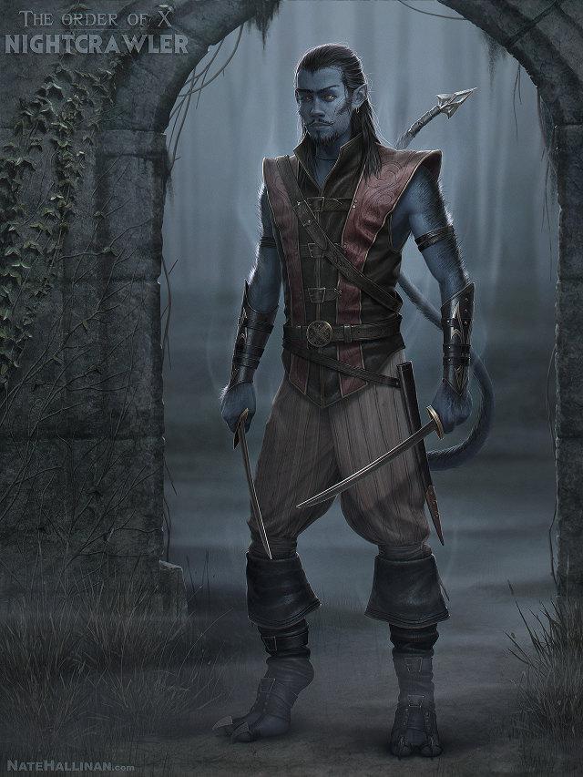 6 Dicembre 20168 anni comment_1284573 Kurt Wagner/Nightcrawler Esco al seguito degli altri, con le scimitarre gemelle estratte. Tengo i sensi allerta, lasciando passare la popolazione, sicuro che non mi toccheranno. In fondo essere un figlio del demonio ha i suoi vantaggi in situazione del genere. Quando il nostro compagno ci fa segno di rimanere in silenzio vado a nascondermi dietro un muro, mentre la coda fende l'aria nervosa. Sentendo il rumore molesto e la conseguente risata scuoto la testa, per poi urlare quando crolla il palazzo Unglaublich! Vedendo che il mio compagno sta bene, capisco che dobbiamo pensare alla creatura responsabile di questo disastro Lui non è decisamente gentile, ci penserò io confonderlo un po'. Che il Signore ci protegga. Parlo poi in una lingua incomprensibile con l'esserino sulla spalla, prima di richiamare il mio retaggio per confondermi con i dintorni. Descrizione Spoiler Un ragazzo alto e slanciato, ma...particolare. Si nota in lui una forte influenza infernale, per via di varie mutazioni sparse sul corpo: una coda prensile a punta di freccia, due occhi gialli e luminosi, orecchie a punta e una pelle blu come la notte. Ha mani con tre dita artigliate e piedi con due soli artigli. I capelli neri ricci sono un dettaglio rassicurante nell'inquietante figura, fatto accentuato dalla presenza di una zona d'ombra attorno a lui. Veste con una armatura ad anelli aderente, che mette in mostra la muscolatura scolpita da atleta, e porta al fianco due scimitarre di ottima fattura. Sulla spalla viaggia assieme a lui un esserino peloso e blu, simile al padrone, che parla un linguaggio incomprensibile a tutti tranne che a Kurt. Ha un forte accento tedesco, che oramai avete imparato a riconoscere. Master Spoiler Se possibile vorrei aver lanciato prima dei buff, che mi servono per descrivere alcune capacità di Nightcrawler: Immagine speculare: Durata 8 minuti, 1d4+2 immagini create. Defensive Shock: Durata 8 minuti Sempre se possibile mi casto Vanish (dura 5 round). In ogni caso Stealth +20 (+40 con Vanish) Segnala